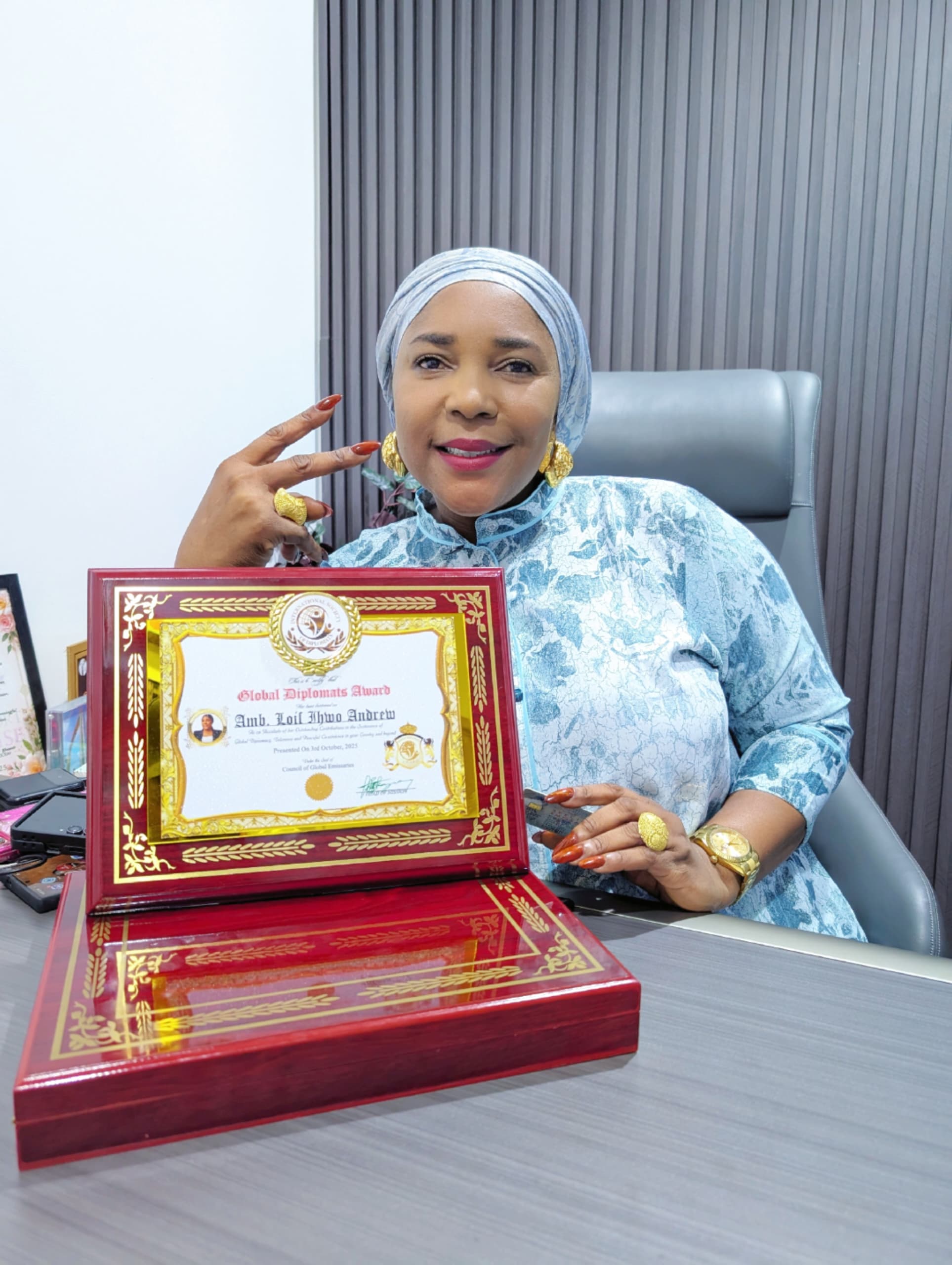 The award qualifies her to affix “Ambassador” to her name, use a customized diplomatic plate number and other insignia of ISD in her name.