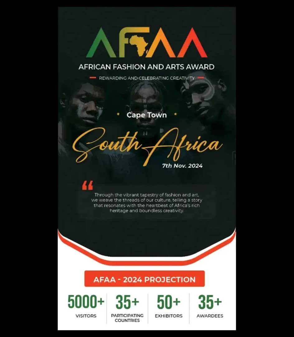 The AFAA 2024 Award Ceremony is scheduled for the 7th of November 2024 in the beautiful city of Cape Town, South Africa. This prestigious event will honor the continent’s most innovative and outstanding creative talents, providing a unique platform to showcase Africa’s rich artistic heritage.