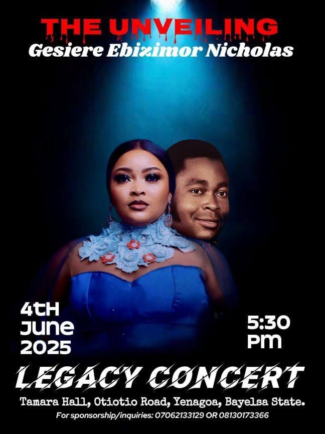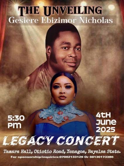 Gesiere Ebizimor Nicholas (PhD) is the daughter of King Dr. Robert Ebizimor. She is set to carry on her father’s music legacy and is inviting the Izon nation to come celebrate the legacy of her father as she unveils herself into the music industry. The concert is titled “Legacy Concert “. Date: WED. 4th June 2025. Venue: Tamara Hall. Time 5:3pm