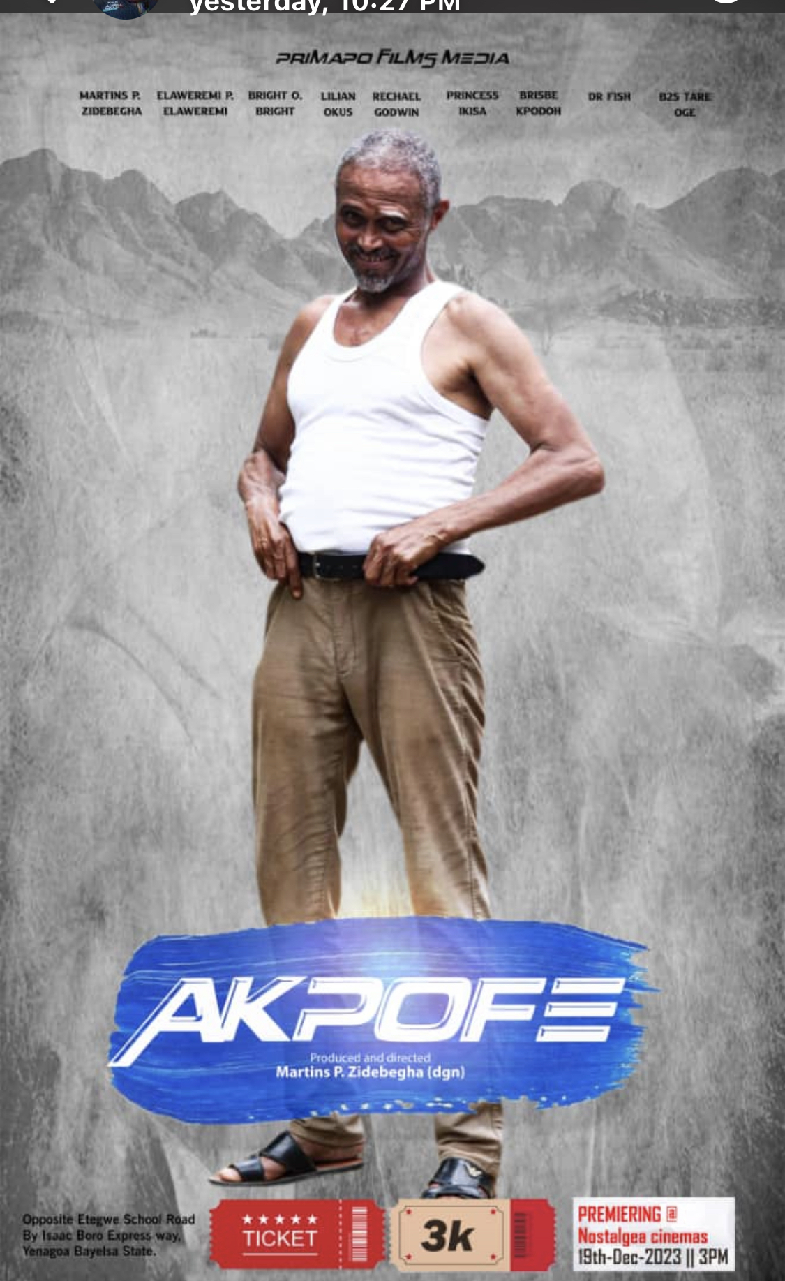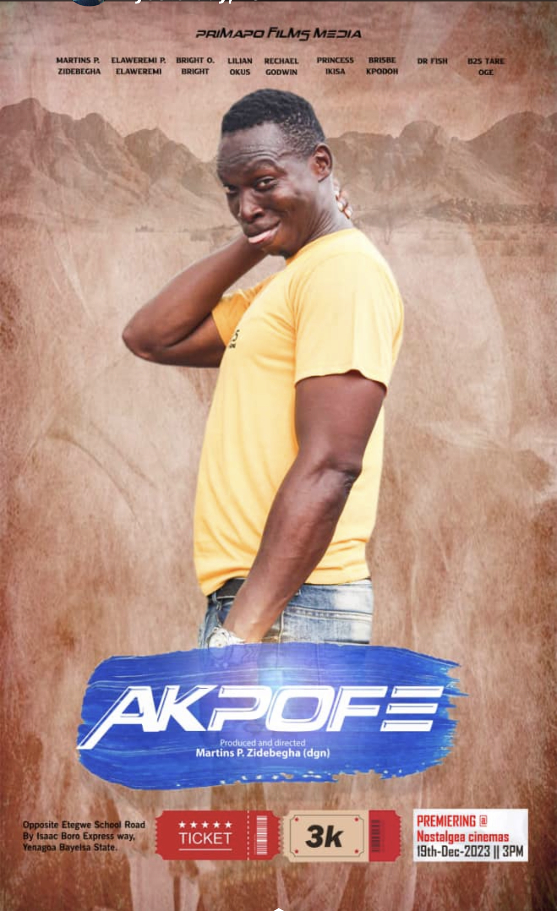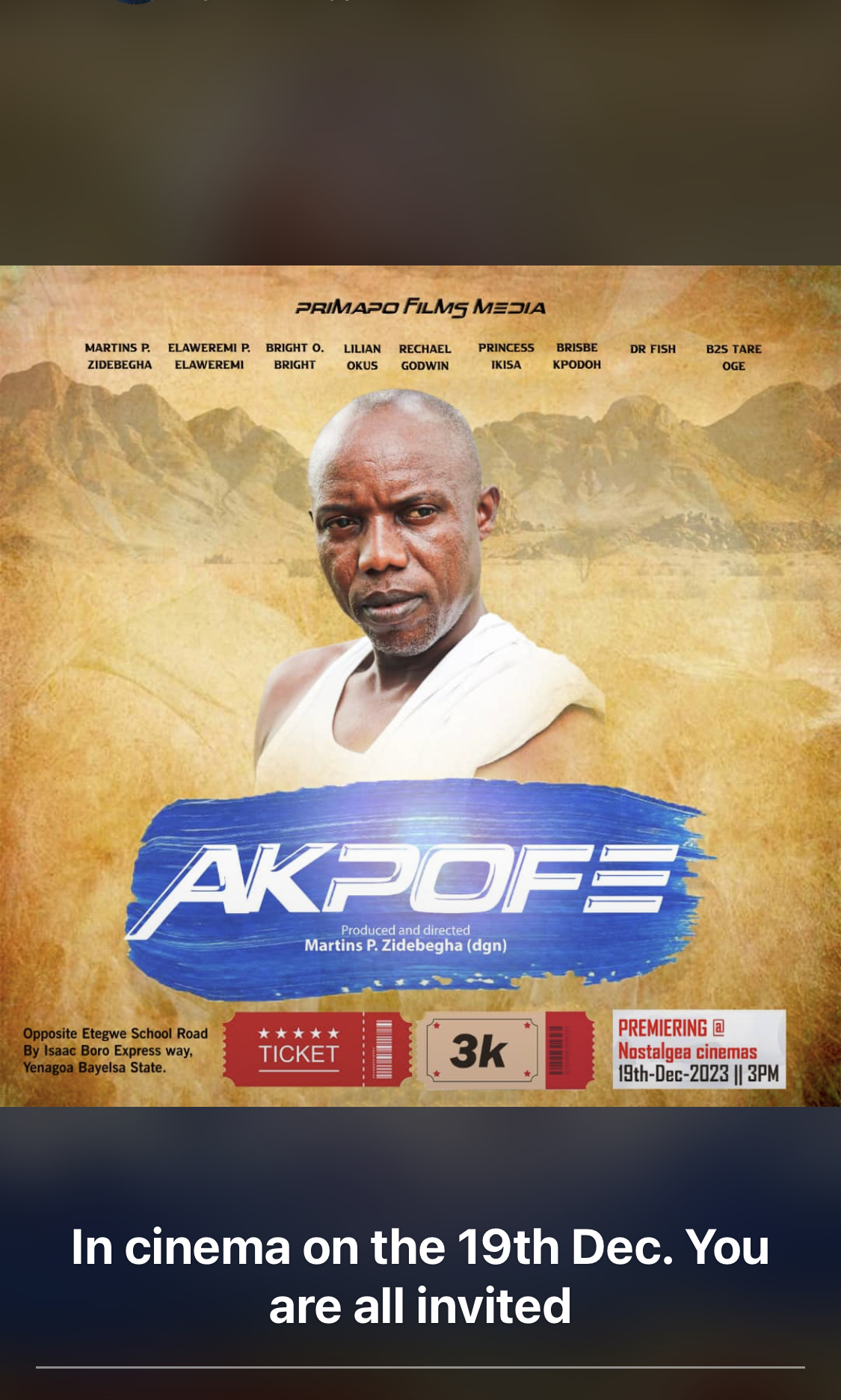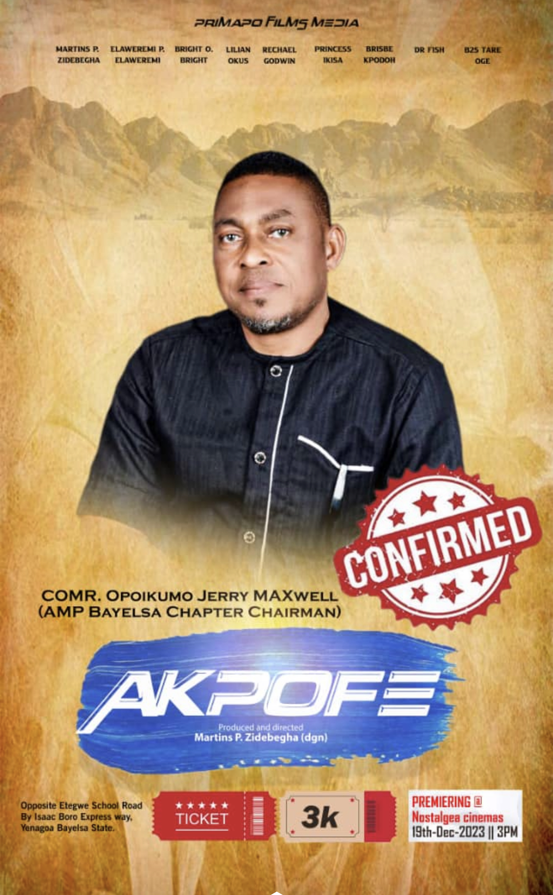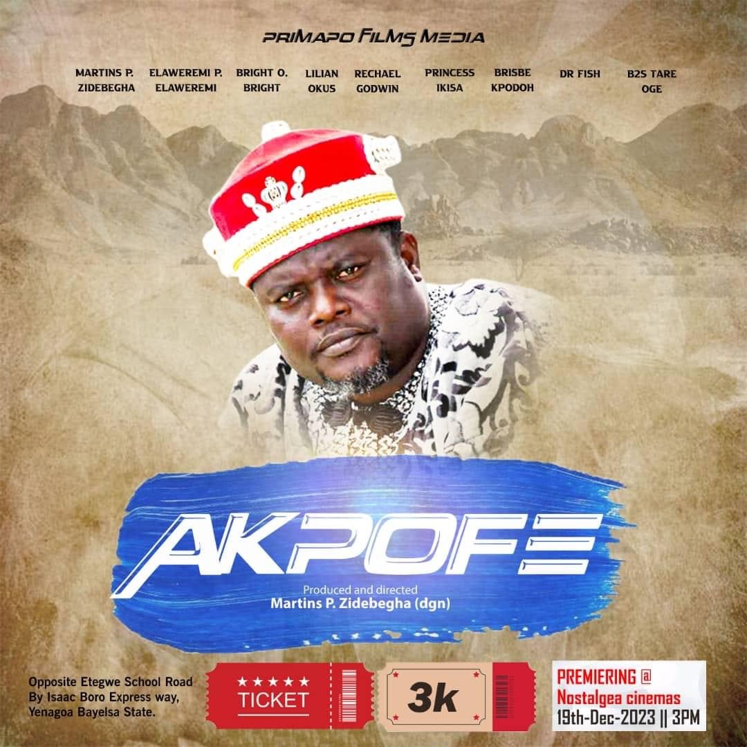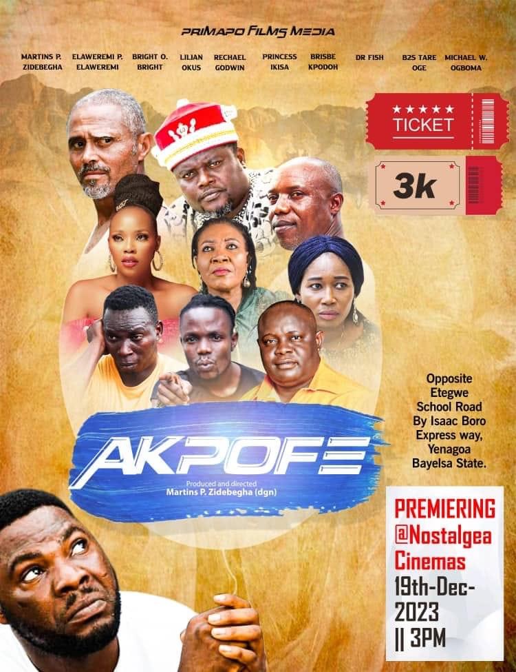 The long-awaited movie Akpofe, a movie which features prominent Bayelsa based stars is set to be premiered At the Mike Angel Cinemas, Nostalgea House Etegwe Yenagoa Bayelsa state.