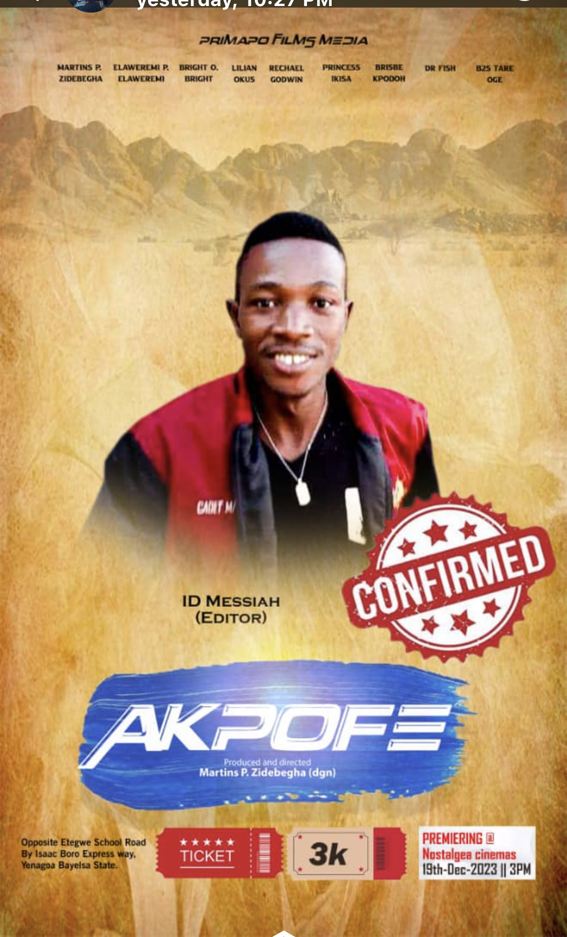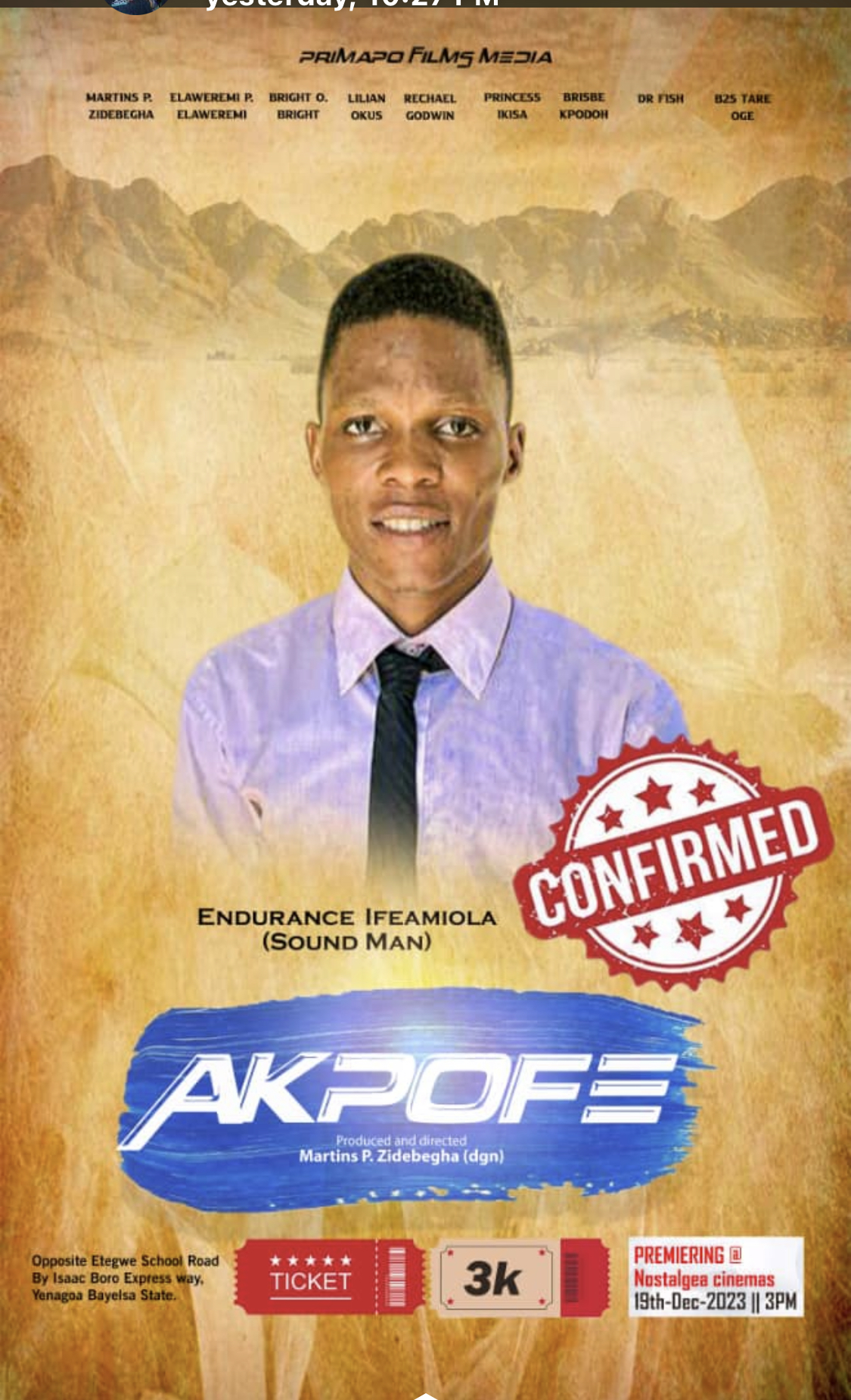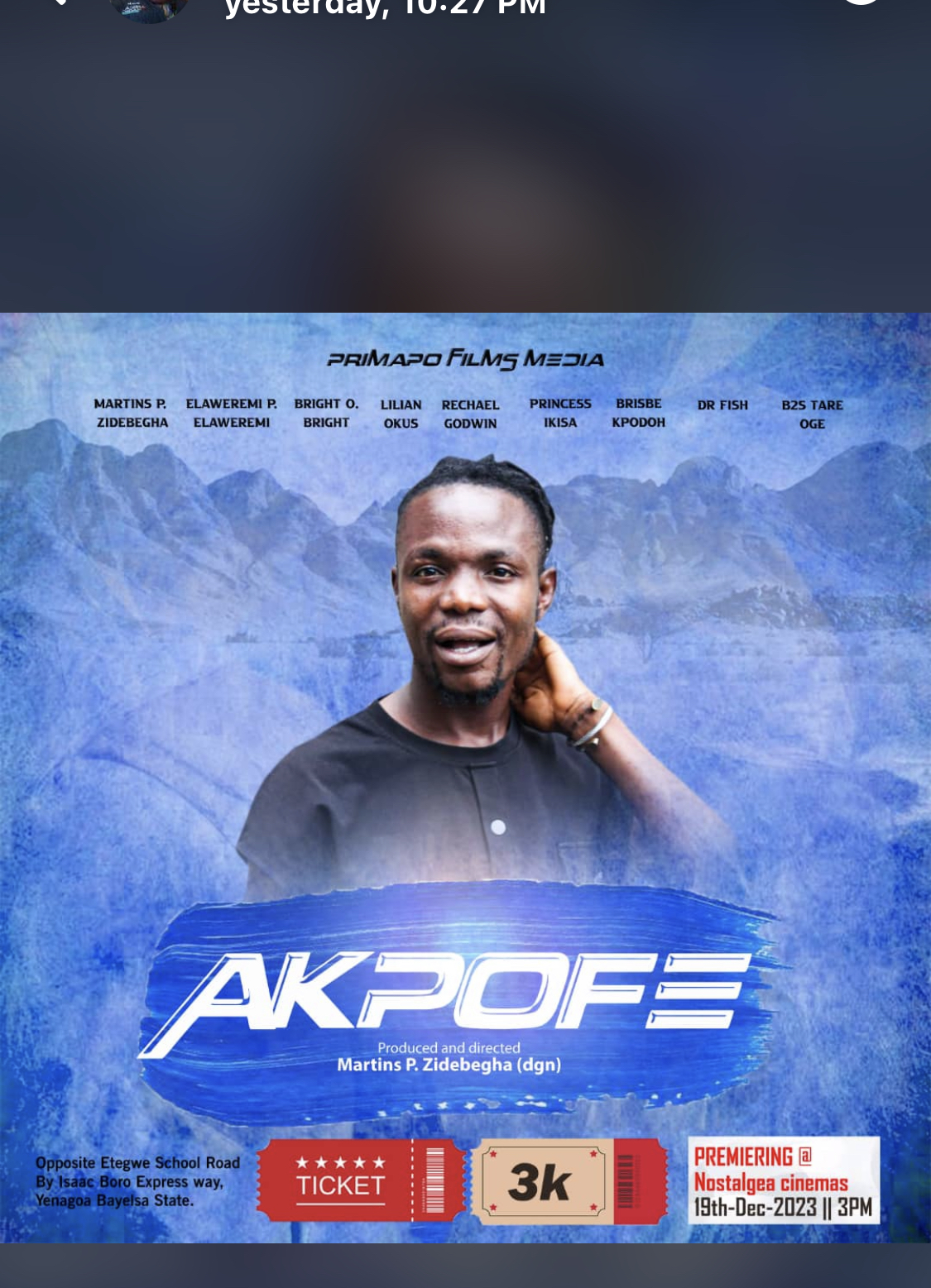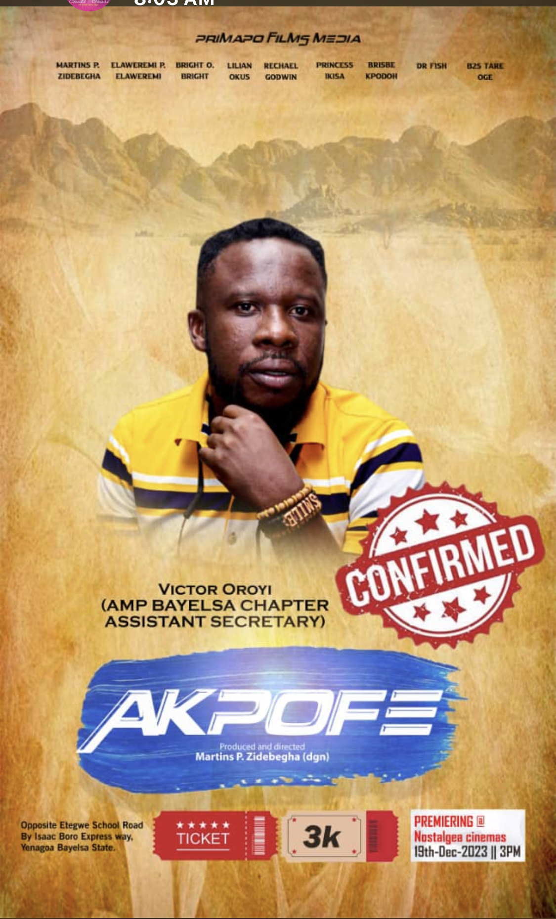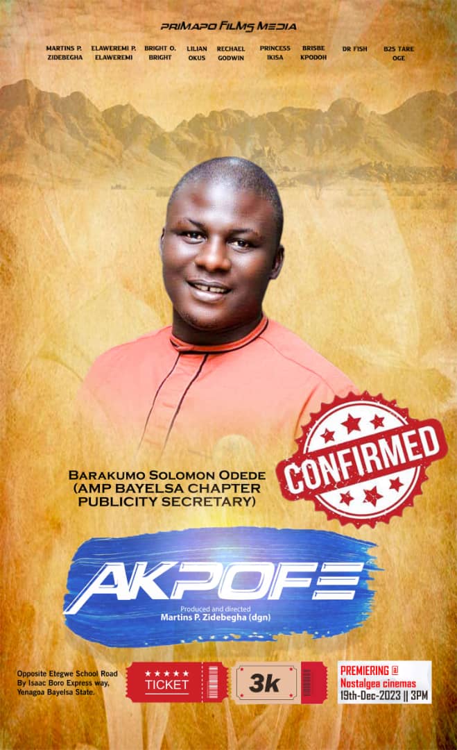 The long-awaited movie Akpofe, a movie which features prominent Bayelsa based stars is set to be premiered At the Mike Angel Cinemas, Nostalgea House Etegwe Yenagoa Bayelsa state.