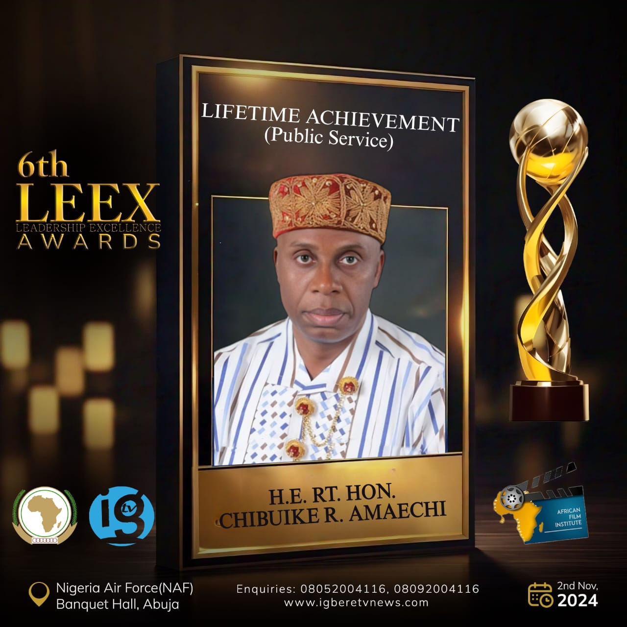 The 6th LEEX Awards, endorsed by the African Union and African Film Institute, will be chaired by Senator T.A. Orji, former Governor of Abia State, with a keynote address by Chief Olusegun Osoba, former Governor of Ogun State. The ceremony will take place at the NAF Conference Hall in Abuja.