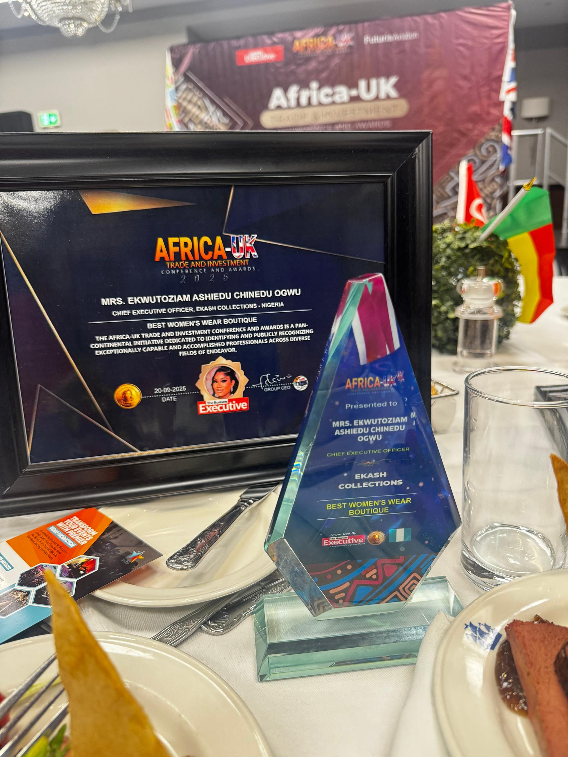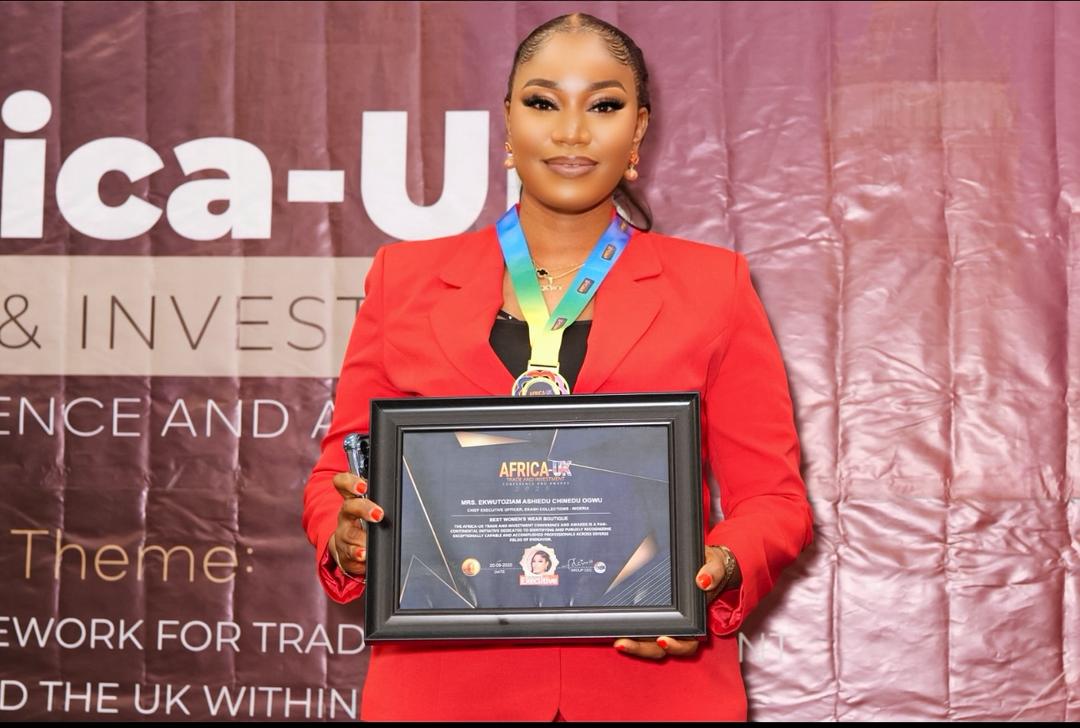 London — Ambassador Ogwus Ekwutoziam Ashiedu, Chief Executive Officer of Ekash Collections, was officially decorated with the Best Women’s Wear Boutique Award at the Africa–UK Trade & Investment Conference & Awards 2025, held at the illustrious Royal National Hotel, London, alongside Africa’s finest business icons.