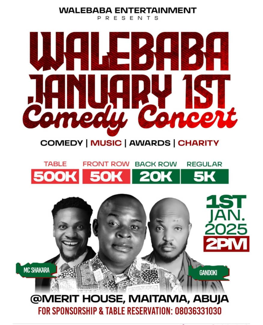 The Jan 1 Walebaba comedy show will hold at Merit House, Maitama Abuja amidst fanfare.