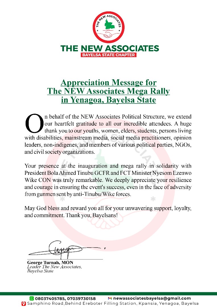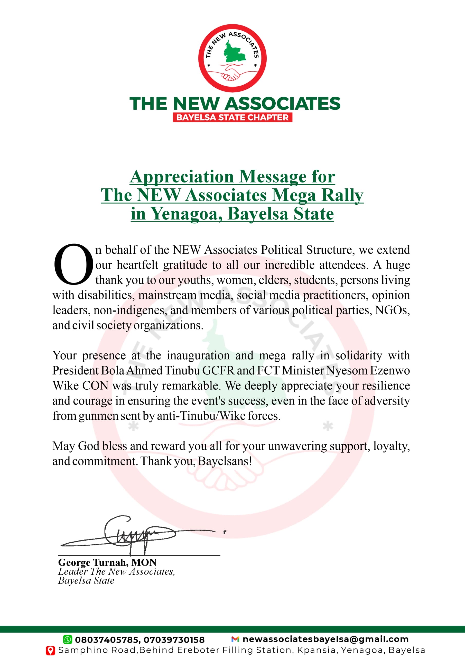 Appreciation Message for the NEW Associates Mega Rally in Yenagoa, Bayelsa State