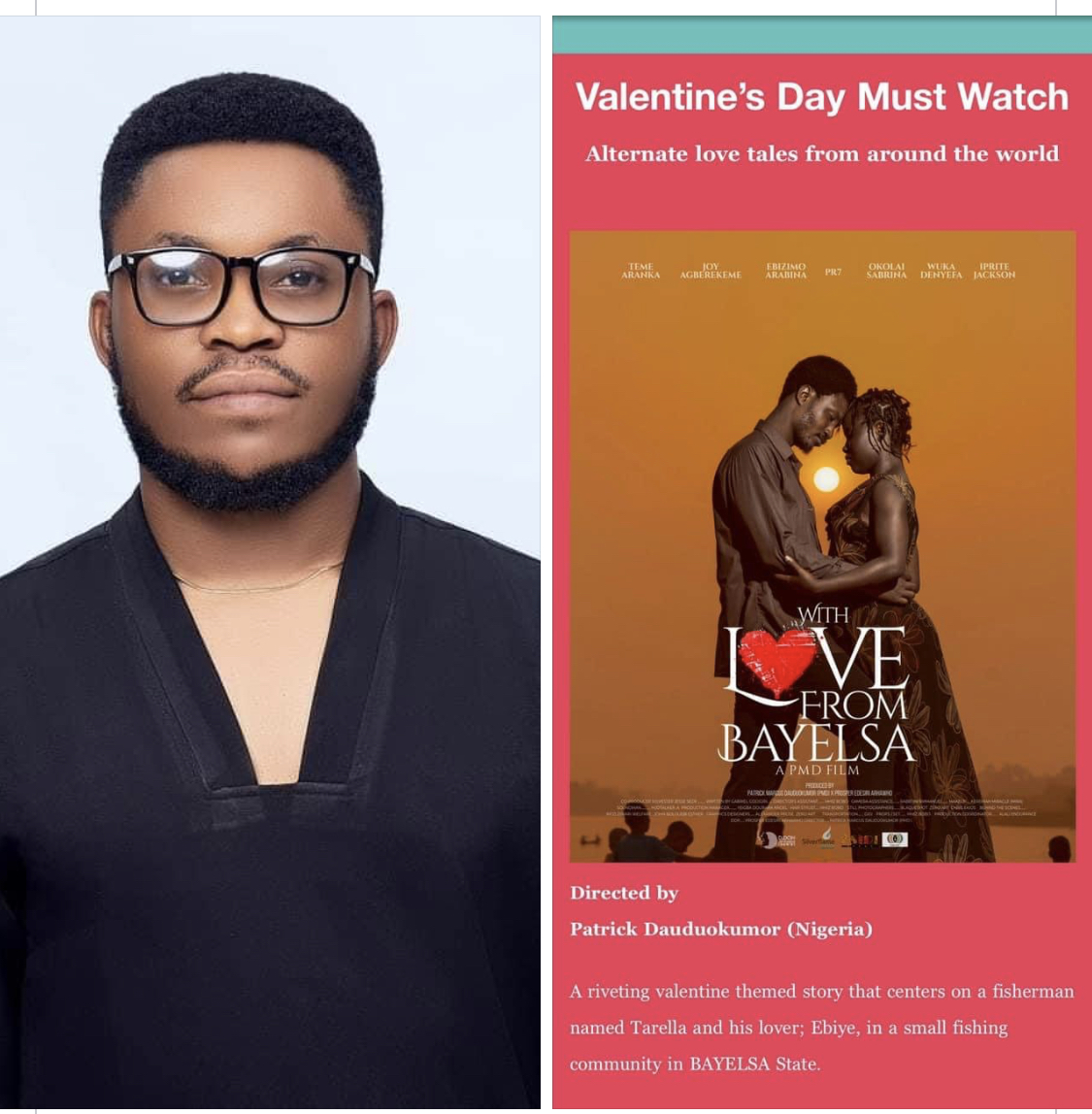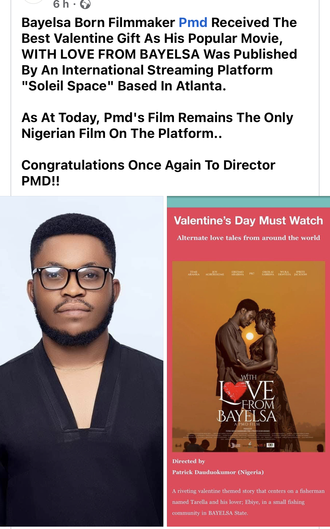 Bayelsa Born Filmmaker Pmd Received The Best Valentine Gift As His Popular Movie, WITH LOVE FROM BAYELSA Was Published By An International Streaming Platform “Soleil Space” Based In Atlanta.