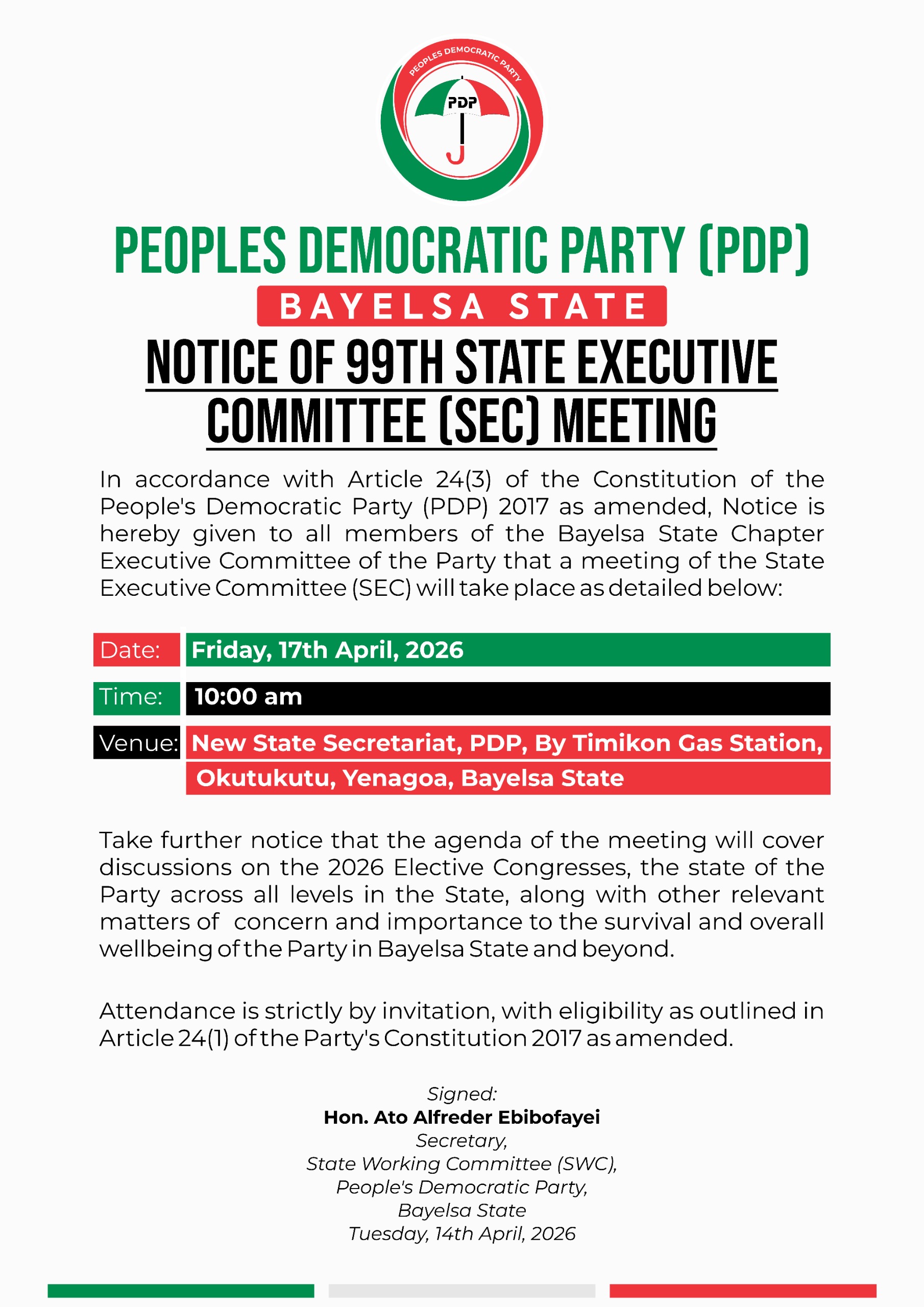 The party disclosed that the meeting, convened in line with the provisions of Article 24(3) of its 2017 Constitution (as amended), will deliberate on critical issues including the recently concluded 2026 elective congresses, the overall state of the party across all levels in Bayelsa State, and other matters central to the survival, unity, and progress of the PDP.