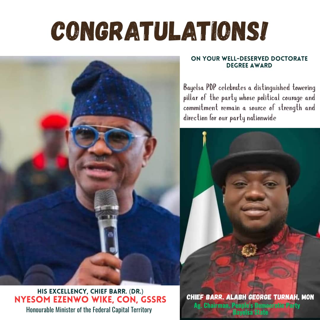Acting Chairman of the People’s Democratic Party (PDP), Bayelsa State Chapter, Hon. Barr. George Turnah, MON, on behalf of the party extends heartfelt congratulations to His Excellency, Chief Barr. Dr. Nyesom Ezenwo Wike, CON, GSSRS, Honourable Minister of the Federal Capital Territory and former Governor of Rivers State, on the conferment of a Doctorate Degree by the prestigious University of Port Harcourt.