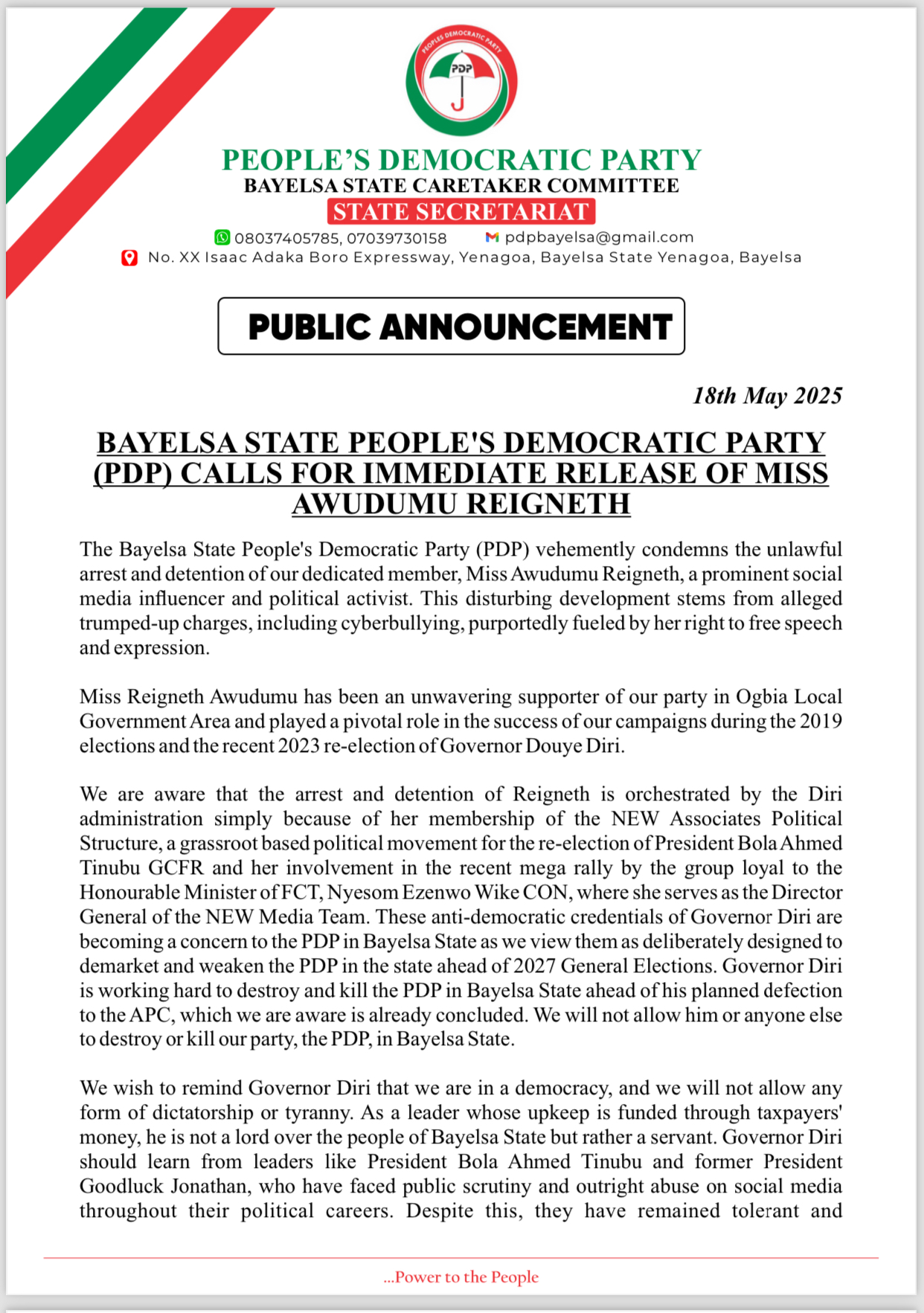 We are aware that the arrest and detention of Reigneth is orchestrated by the Diri administration simply because of her membership of the NEW Associates Political Structure, a grassroot based political movement for the re-election of President Bola Ahmed Tinubu GCFR and her involvement in the recent mega rally by the group loyal to the Honourable Minister of FCT, Nyesom Ezenwo Wike CON, where she serves as the Director General of the NEW Media Team. These anti-democratic credentials of Governor Diri are becoming a concern to the PDP in Bayelsa State as we view them as deliberately designed to demarket and weaken the PDP in the state ahead of 2027 General Elections. Governor Diri is working hard to destroy and kill the PDP in Bayelsa State ahead of his planned defection to the APC, which we are aware is already concluded. We will not allow him or anyone else to destroy or kill our party, the PDP, in Bayelsa State.