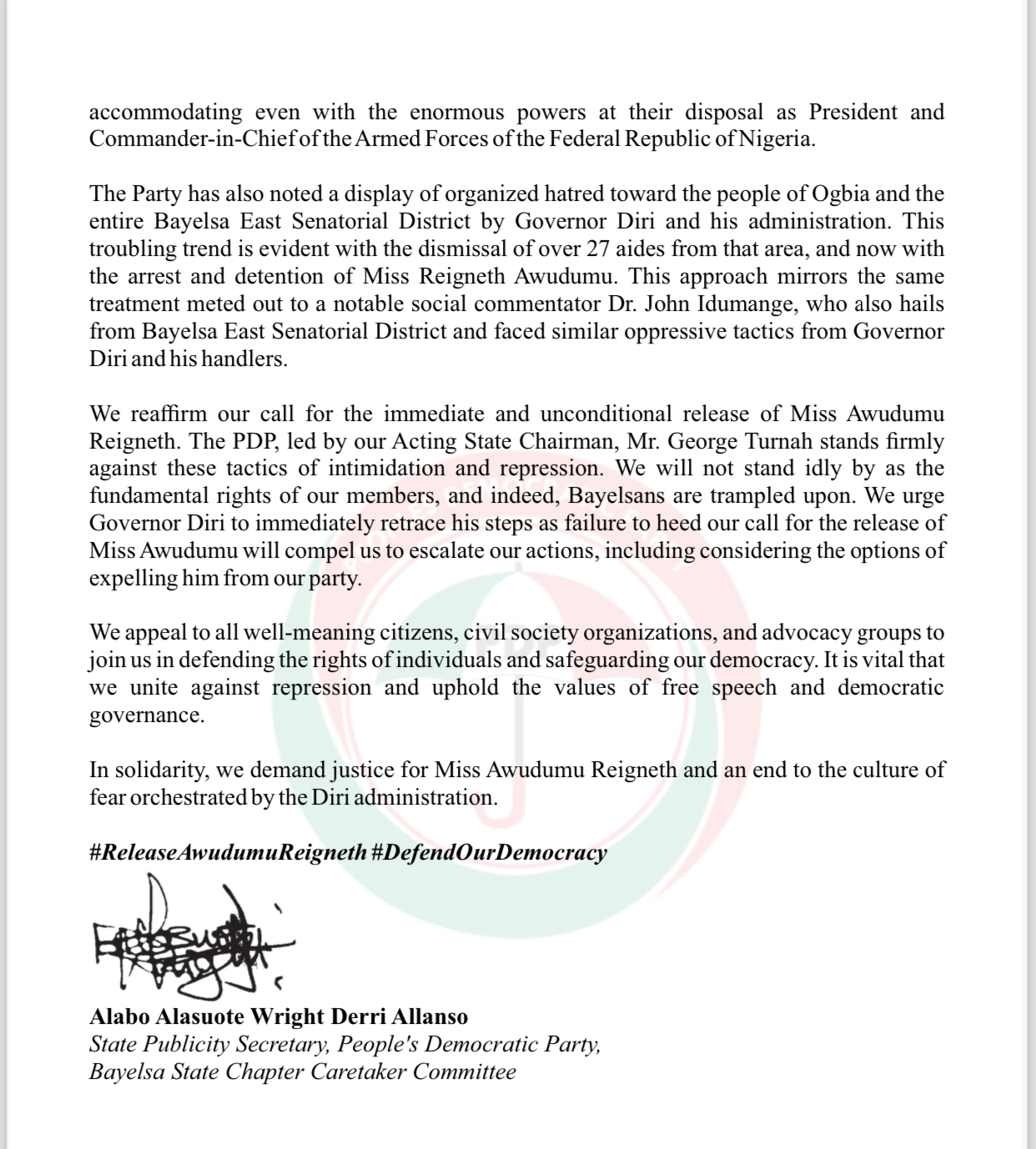 We reaffirm our call for the immediate and unconditional release of Miss Awudumu Reigneth. The PDP, led by our Acting State Chairman, Mr. George Turnah stands firmly against these tactics of intimidation and repression. We will not stand idly by as the fundamental rights of our members, and indeed, Bayelsans are trampled upon. We urge Governor Diri to immediately retrace his steps as failure to heed our call for the release of Miss Awudumu will compel us to escalate our actions, including considering the options of expelling him from our party.
