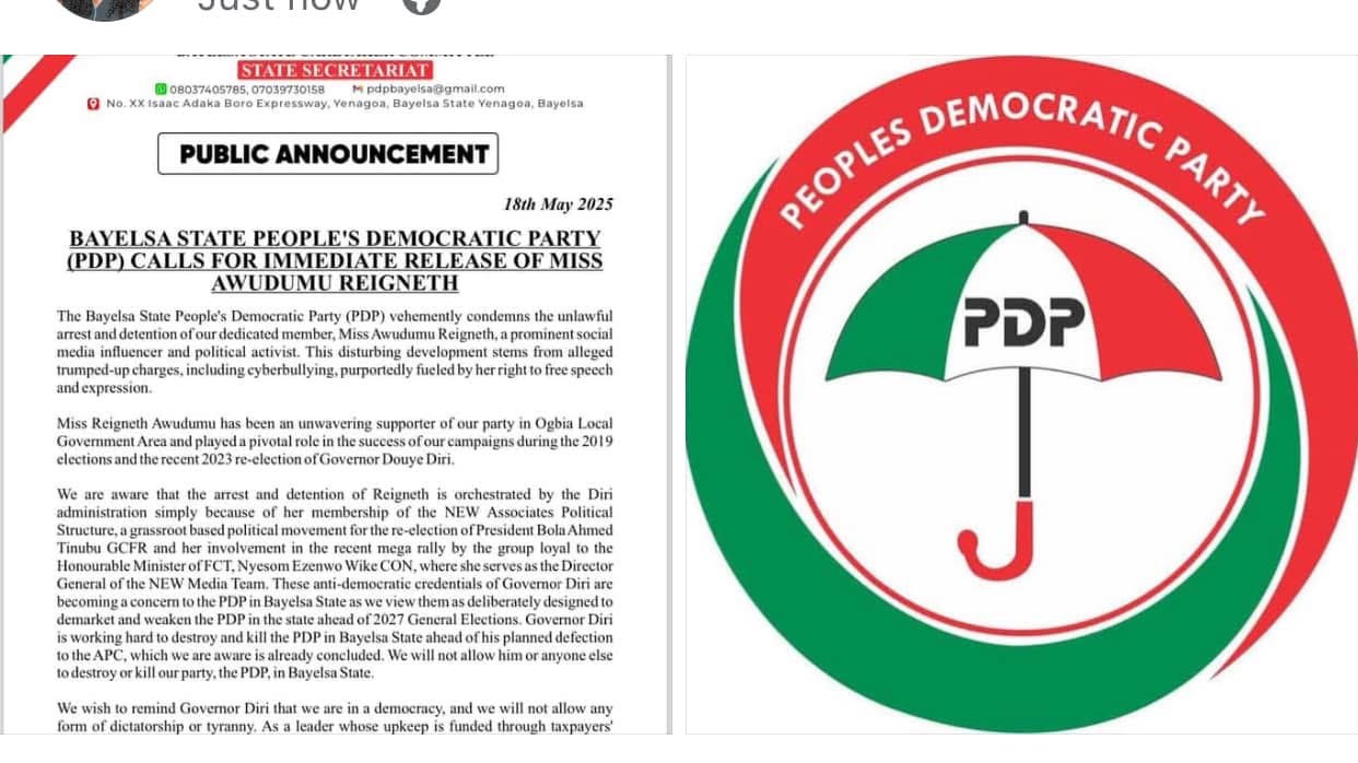 The Bayelsa State People’s Democratic Party (PDP) vehemently condemns the unlawful arrest and detention of our dedicated member, Miss Awudumu Reigneth, a prominent social media influencer and political activist. This disturbing development stems from alleged trumped-up charges, including cyberbullying, purportedly fueled by her right to free speech and expression.