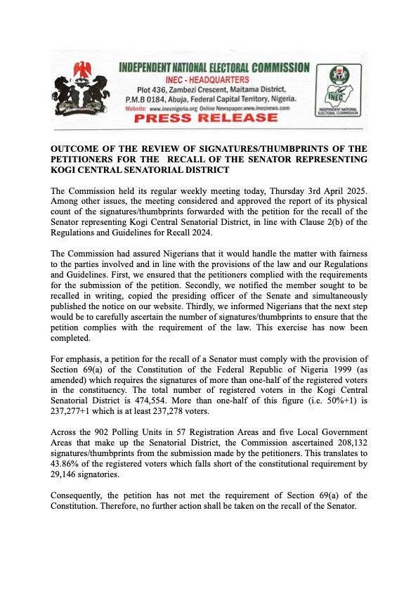 The Commission held its regular weekly meeting today, Thursday 3rd April 2025. Among other issues, the meeting considered and approved the report of its physical count of the signatures/thumbprints forwarded with the petition for the recall of the Senator representing Kogi Central Senatorial District, in line with Clause 2(b) of the Regulations and Guidelines for Recall 2024.