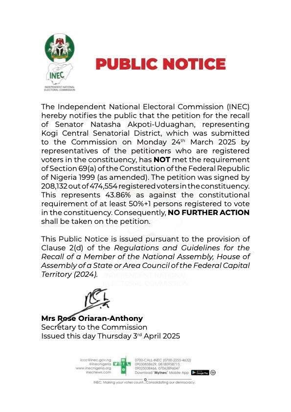 In line with the provision of Clause 2(d) of the Regulations and Guidelines for Recall 2024, the Commission has issued a Public Notice to that effect which is also copied to the presiding officer of the Senate.