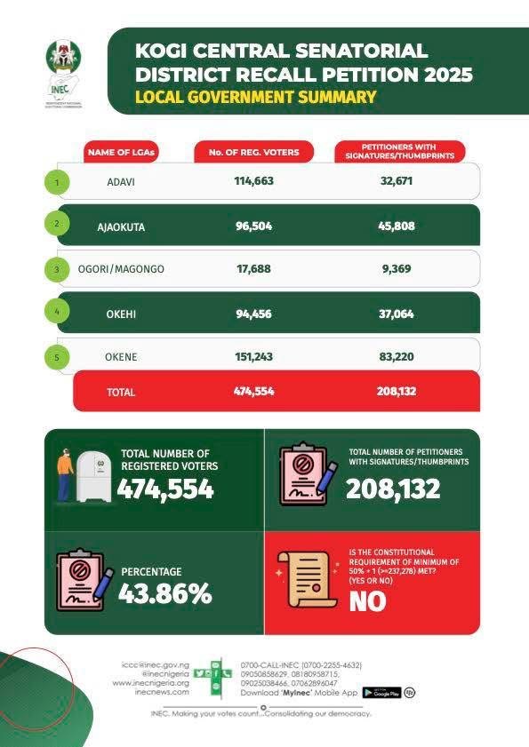 Across the 902 Polling Units in 57 Registration Areas and five Local Government Areas that make up the Senatorial District, the Commission ascertained 208,132 signatures/thumbprints from the submission made by the petitioners. This translates to 43.86% of the registered voters which falls short of the constitutional requirement by 29,146 signatories.