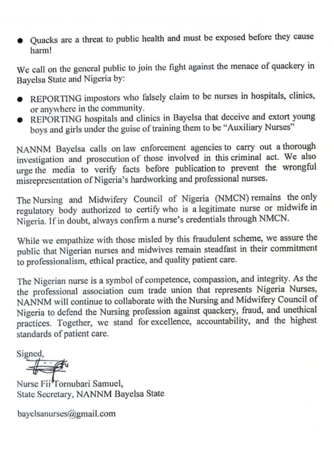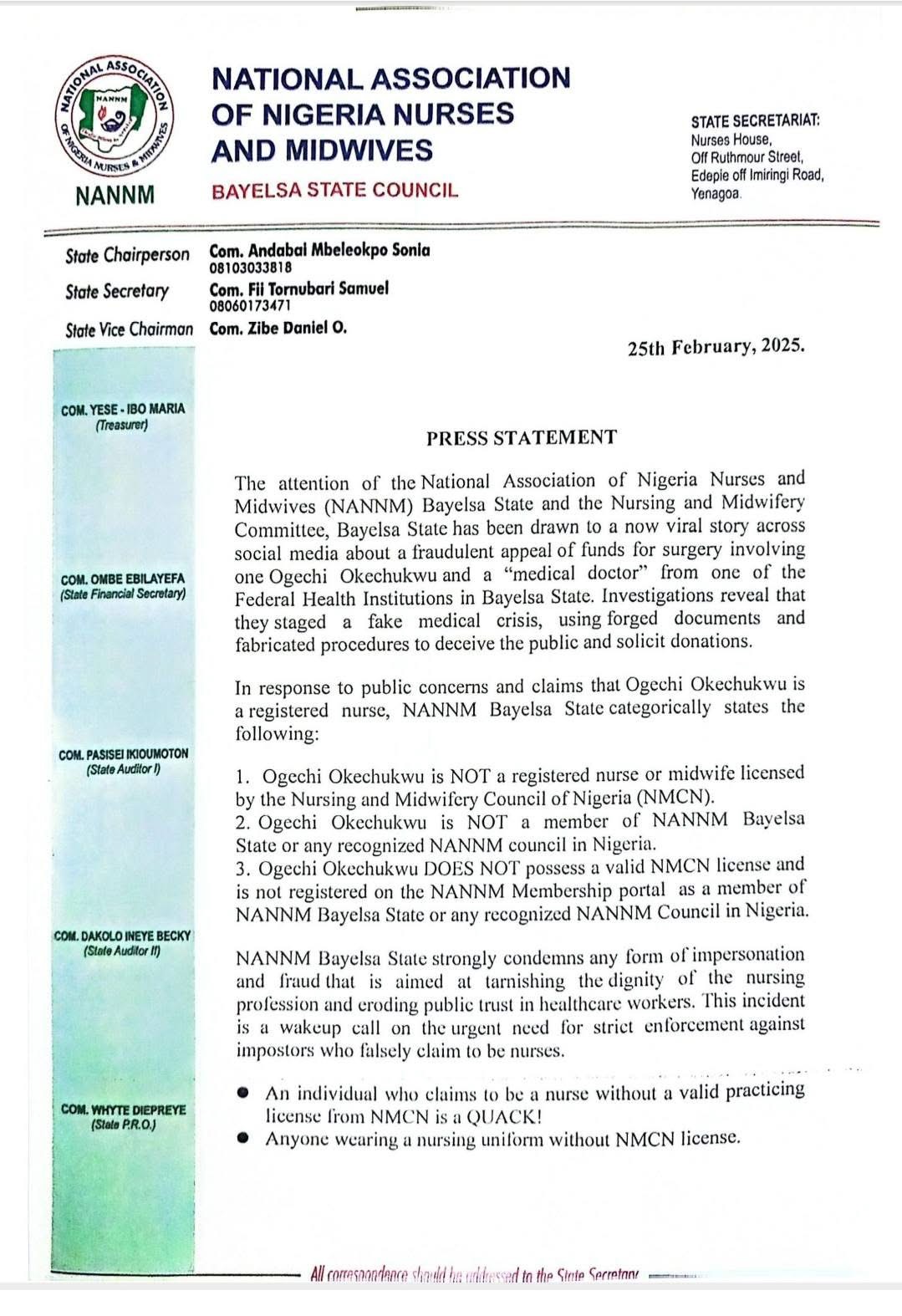 Breaking news: BAYELSA STATE NURSES DISMISSES CLAIMS OF BEING A NURSE BY ONE Ogechi Okechukwu