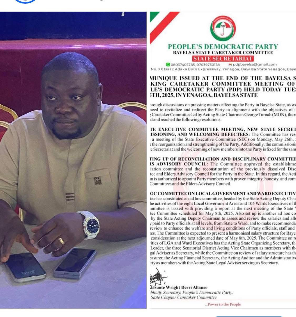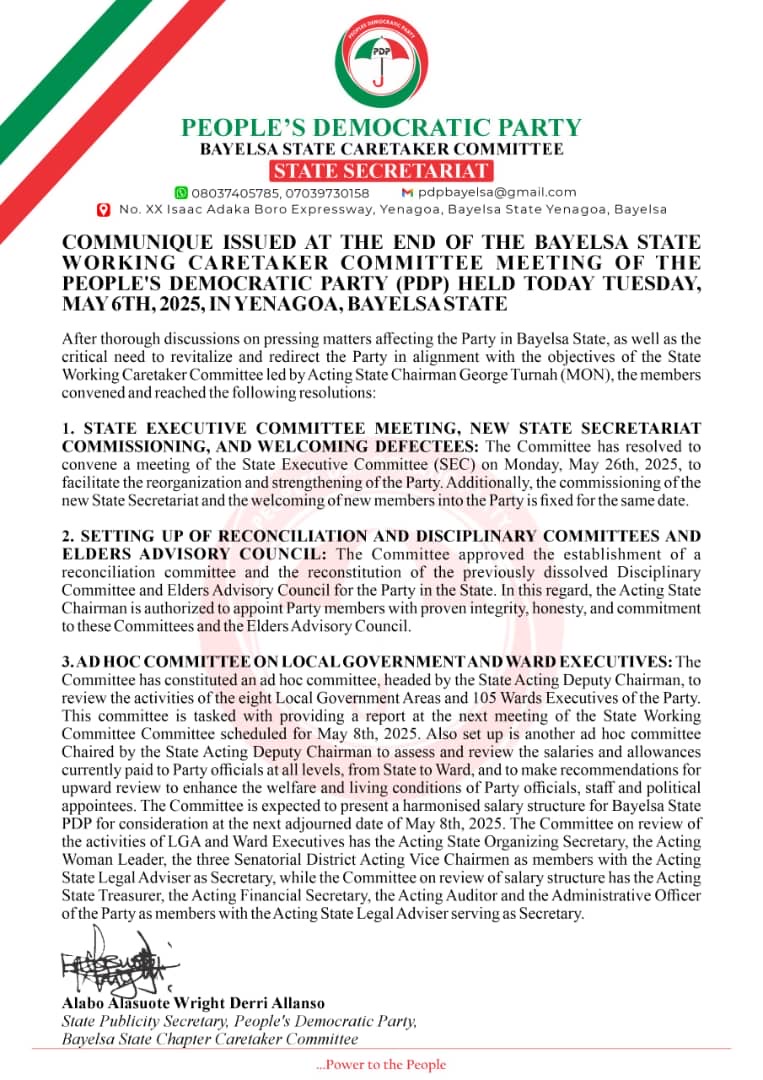 BREAKING NEWS: COMMUNIQUE ISSUED AT THE END OF THE BAYELSA STATE WORKING CARETAKER COMMITTEE MEETING OF THE PEOPLE’S DEMOCRATIC PARTY (PDP) HELD TODAY TUESDAY, MAY 6TH, 2025, IN YENAGOA, BAYELSA STATE