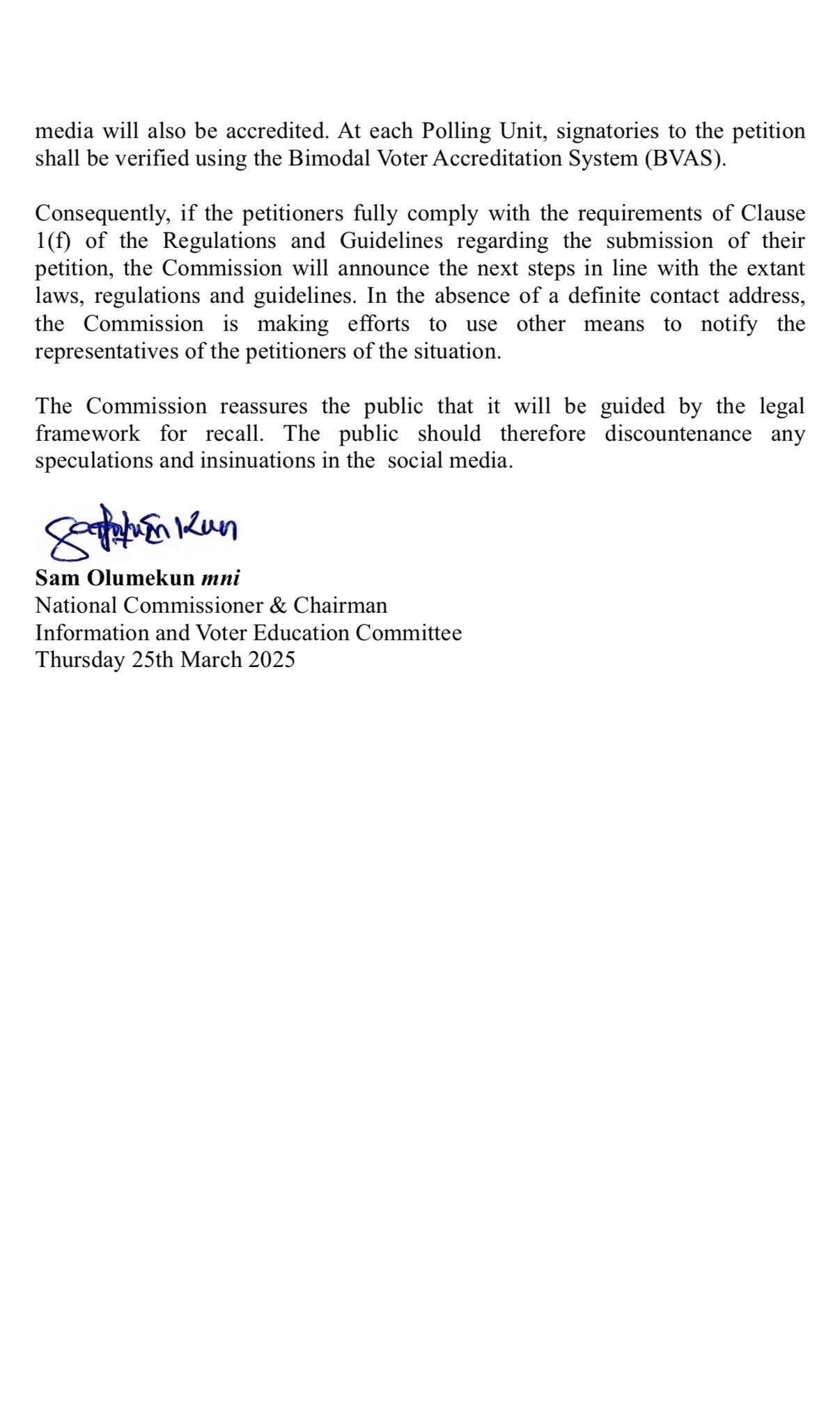 The process of recall is enshrined in the 1999 Constitution, the Electoral Act 2022 as well as the Commission’s detailed Regulations and Guidelines for Recall 2024, available on our website. All petitions will be treated in strict compliance with the legal framework.