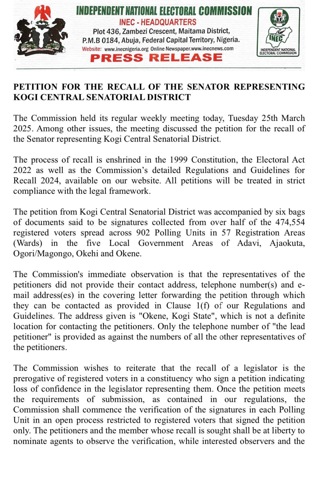 The Commission held its regular weekly meeting today, Tuesday 25th March 2025. Among other issues, the meeting discussed the petition for the recall of the Senator representing Kogi Central Senatorial District.