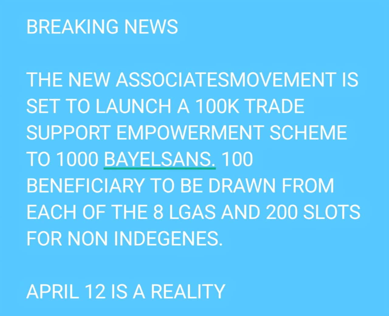 BREAKING NEWS. The New Associate Movement is set to launch a 100k trade Support Empowerment Scheme to 1000 Bayelsans. 100 beneficiary to be drawn from each of the 8 LGA’S and 200 slots for Non Indegenes.