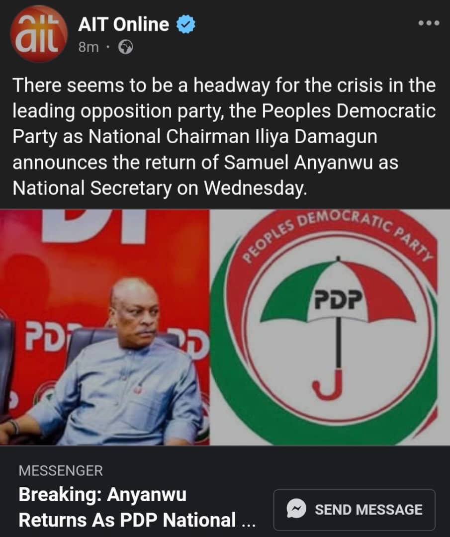 Breaking…Sen Samuel Anyanwu officially resume as PDP National Secretary.