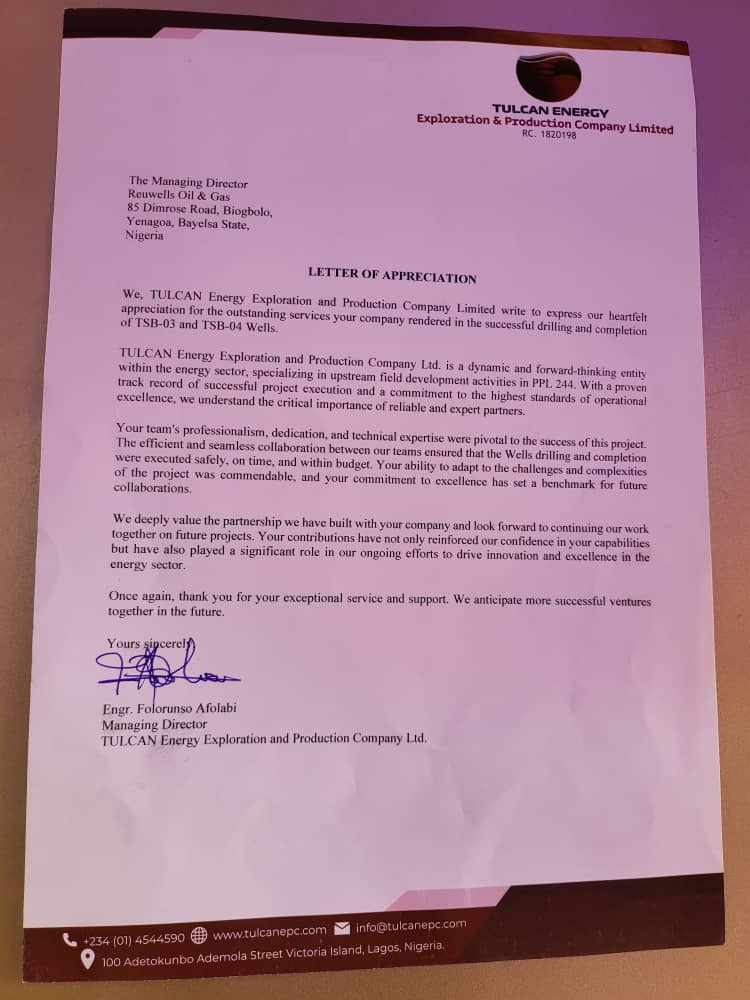 We the TULCAN Energy Exploration and Production Company limited write to express our heartfelt appreciation for the outstanding services your company rendered in the successful Drilling and completion of TSB-03 and TSB-04 Wells.