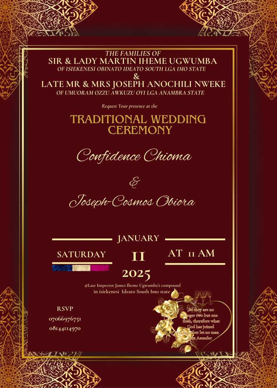 All road will lead to the home of late Inspector James Iheme Ugwumba in Isiekenesi, Ideato South local government area of Imo state as elegant looking Confidence Chioma says I do to her charming prince, a popular Abuja based hospitality entrepreneur, Joseph Cosmos Obiora