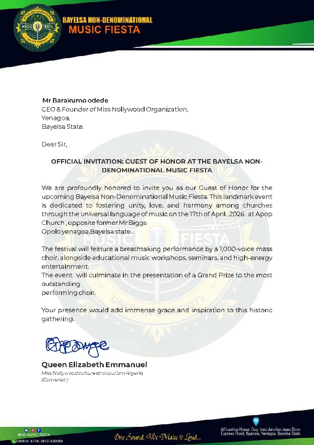 The Chief Executive Officer of TVAFRICA24, Mr. Barakumo Odede, has been officially invited as Special Guest of Honour at the forthcoming Bayelsa Non-Denominational Music Fiesta, a major faith-based cultural event aimed at promoting unity among churches.