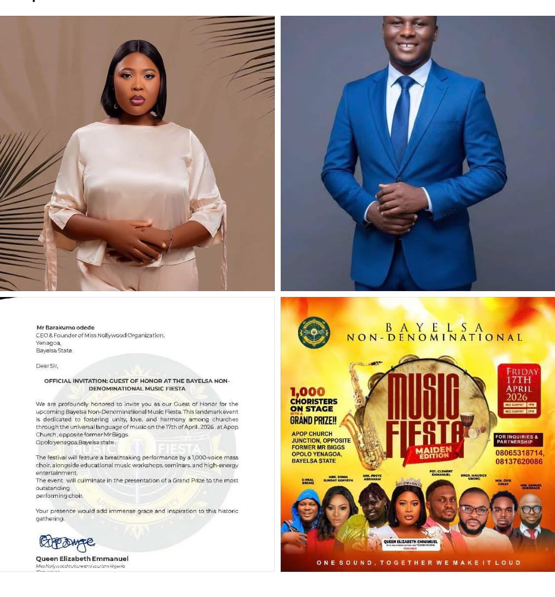 The Bayelsa Non-Denominational Music Fiesta is scheduled to hold on April 17, 2026, at Apop Church, located opposite the former Mr. Biggs in Opolo, Yenagoa, Bayelsa State.