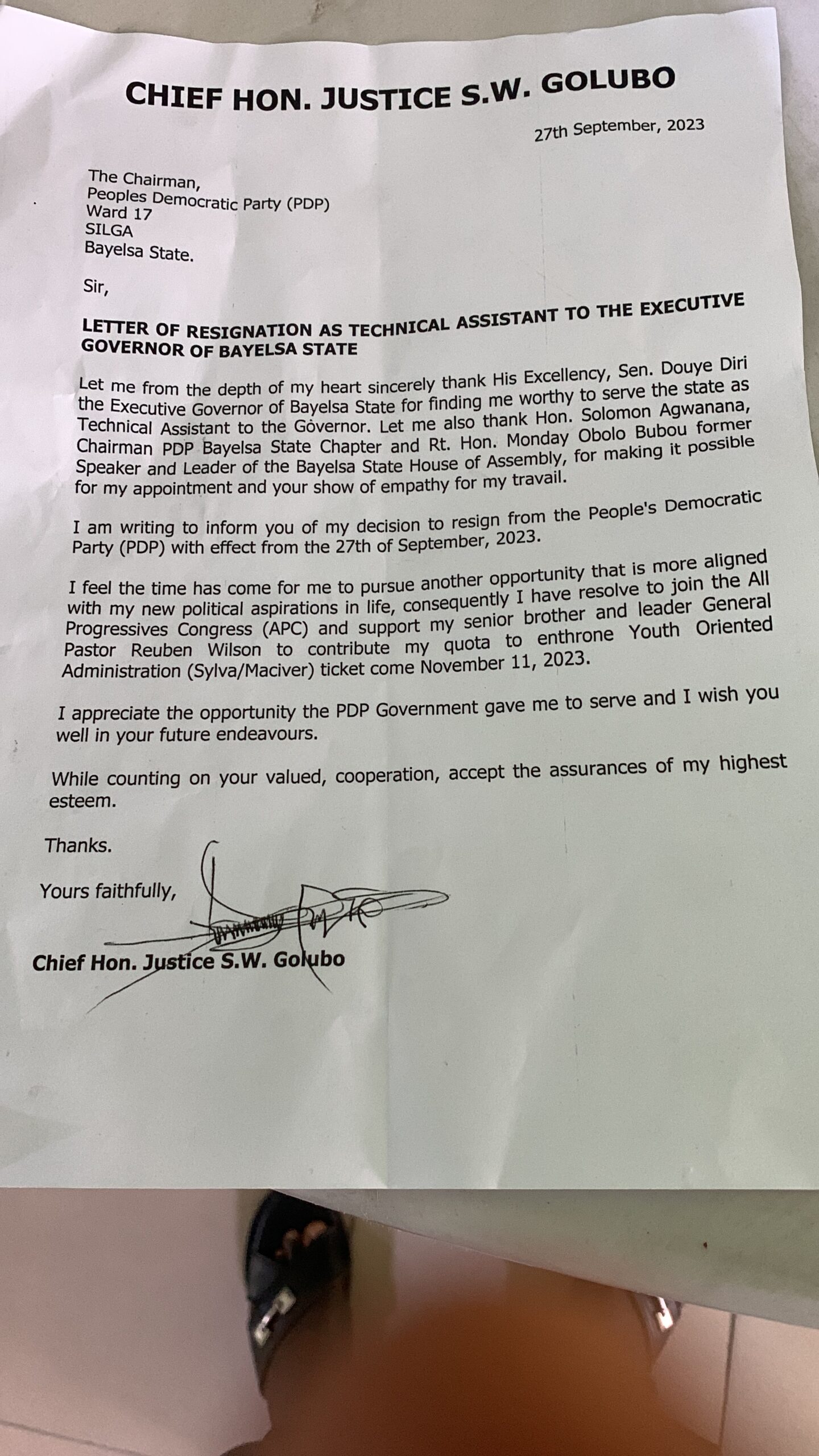 I am writing to inform you of my decision to resign from the peoples Democratic Party (PDP) with effect from the 27th of September, 2023.