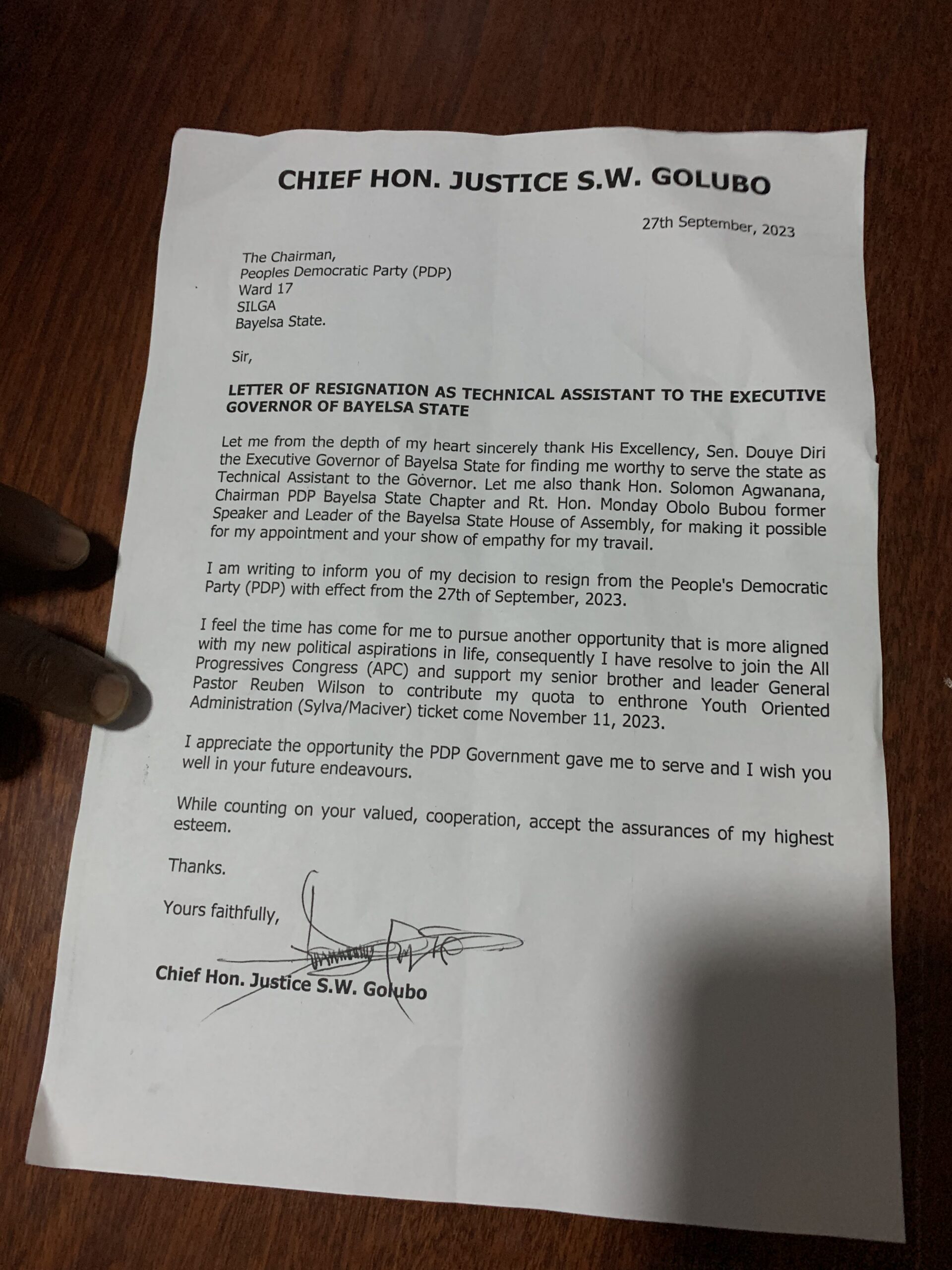 I am writing to inform you of my decision to resign from the peoples Democratic Party (PDP) with effect from the 27th of September, 2023.