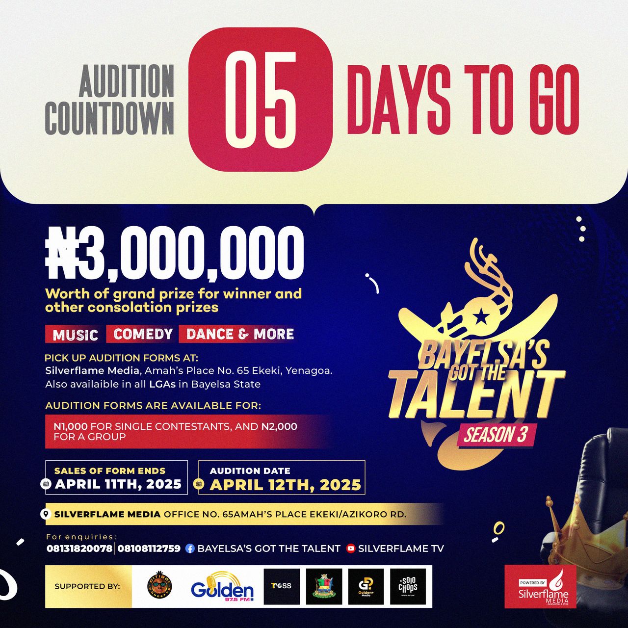 Countdown to the Audition of the forthcoming Bayelsa Got the TALENT Season 3 with winner 3Million Naira
