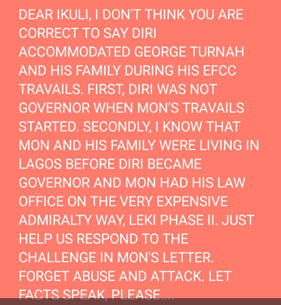 Dear Ikuli, I don’t think you are Correct to say Diri Accommodated me and my family During EFCC SAGA( GEORGE TURNER Replies