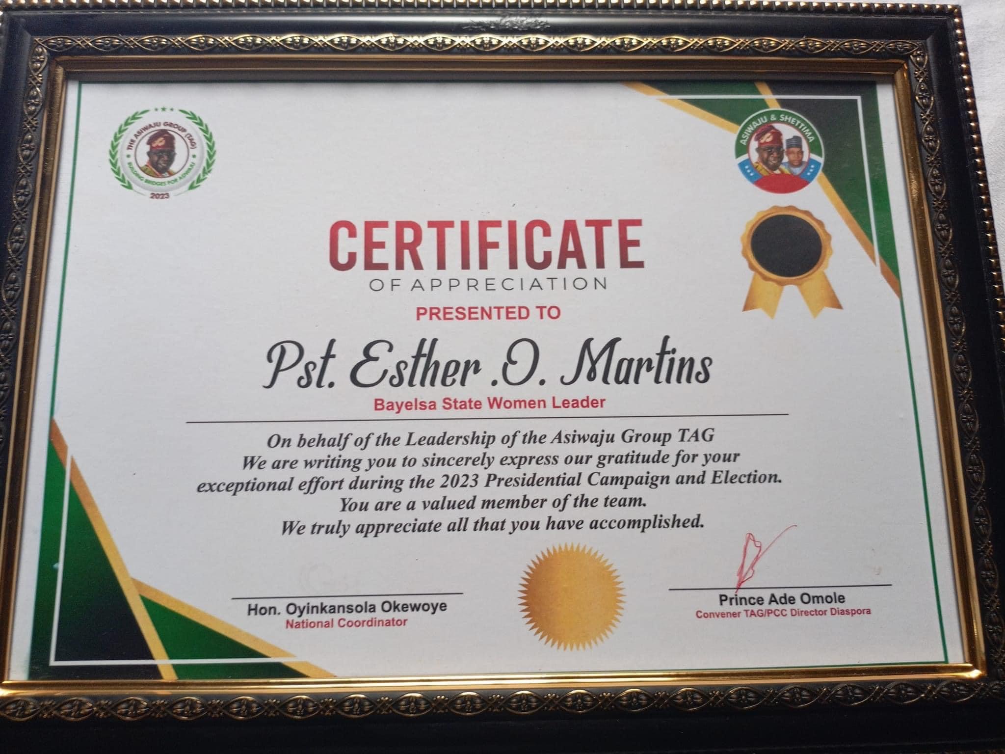 When I saw this certificate of Appreciation that was sent to me by the Asiwaju group known as TAG from Abuja I felt honored.
