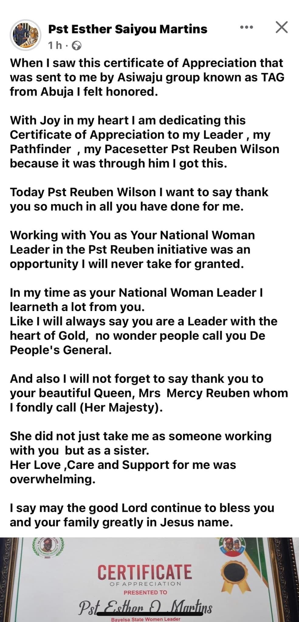 With Joy in my heart I am dedicating this Certificate of Appreciation to my Leader , my Pathfinder, my Pacesetter Pst Reuben Wilson because it was through him I got this.