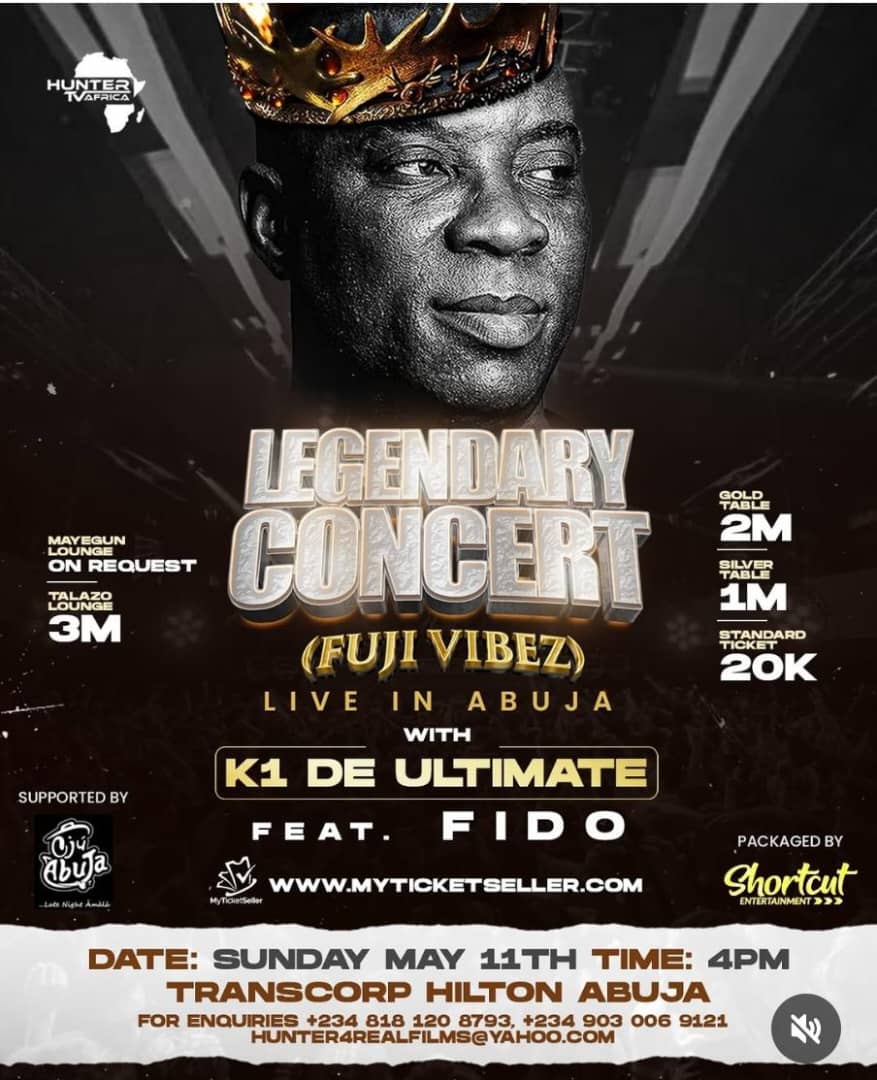 The Legendary Concert organised by Hunter TV Africa will take place on Sunday, May 11, 2025 at the prestigious Transcorp Hilton in Abuja.