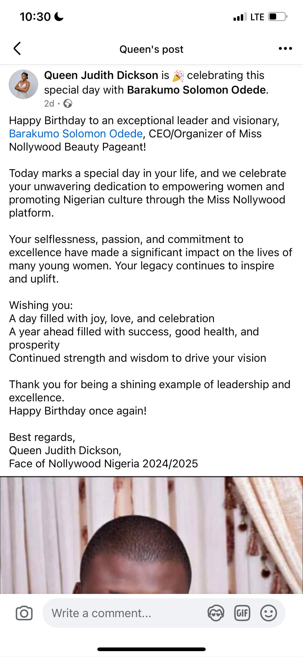 Today marks a special day in your life, and we celebrate your unwavering dedication to empowering women and promoting Nigerian culture through the Miss Nollywood platform.