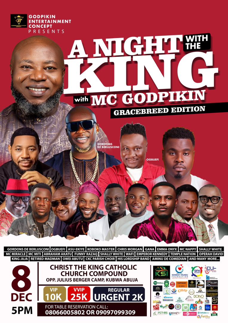 Highly influential entertainers and gospel ministers have been assembled to perform at the upcoming “A Night With The King” being spearheaded by popular Abuja MC and comedian, Kalu Thomas Chijioke, better known as MC Godpikin.