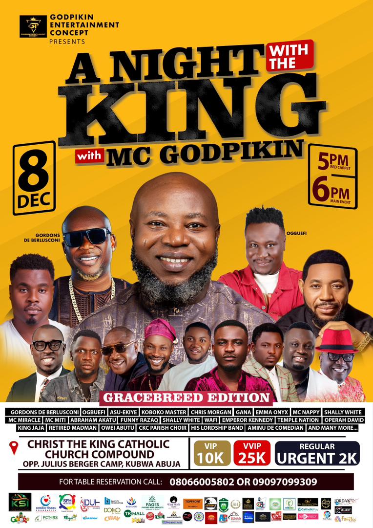 Highly influential entertainers and gospel ministers have been assembled to perform at the upcoming “A Night With The King” being spearheaded by popular Abuja MC and comedian, Kalu Thomas Chijioke, better known as MC Godpikin.