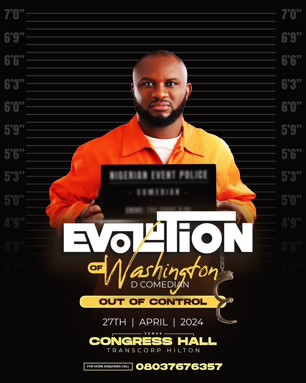 One of the most popular Abuja MCs, Ernest Anyanwu better known as Washington is set to unveil the maiden edition of his comedy show, “Evolution of Washington D Comedian” tagged ‘out of control edition’.