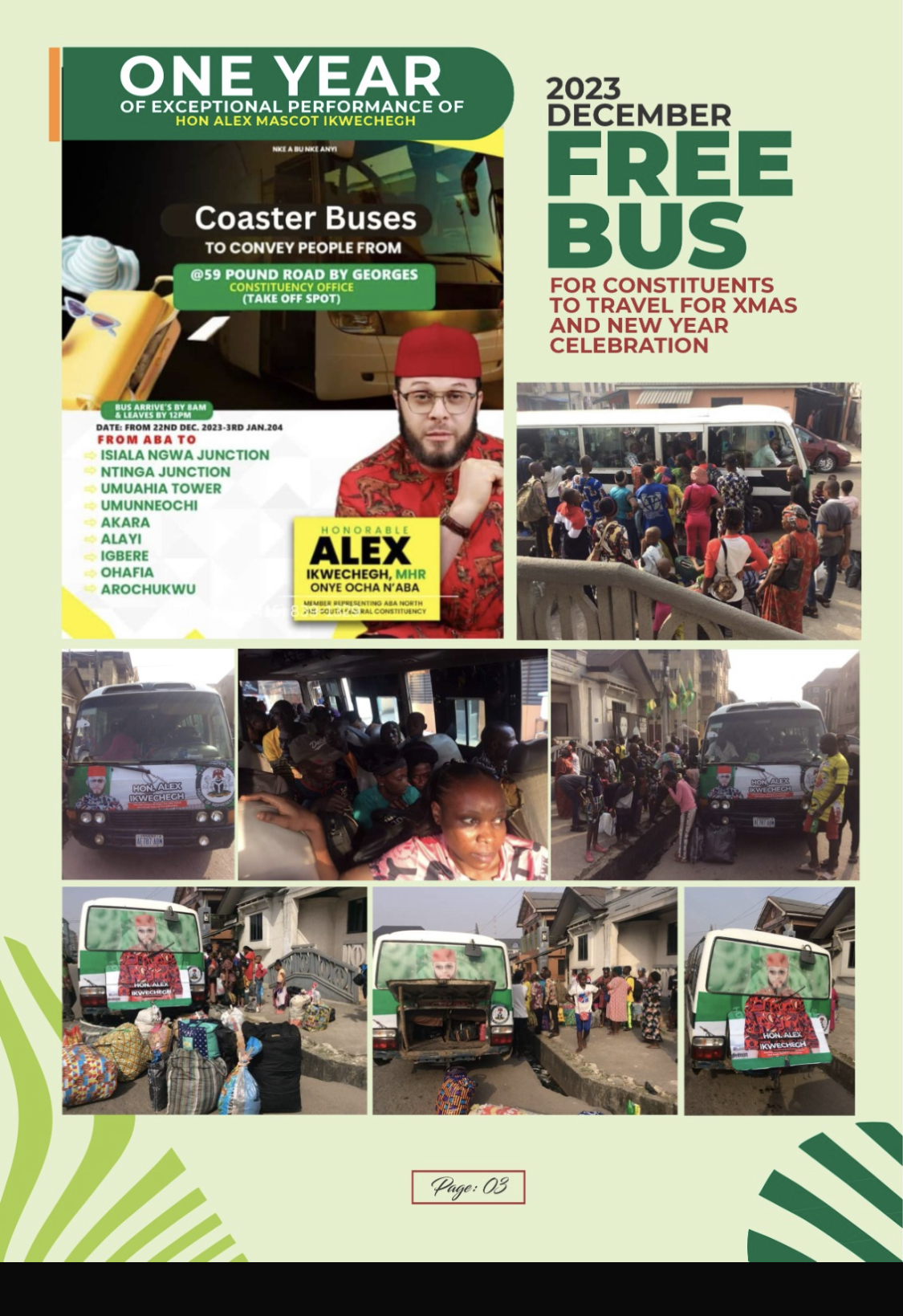 Additionally, he has distributed countless trailer loads of food palliatives, relief materials, and other products to alleviate economic challenges faced by the people. His foundation, the Alex Mascot Foundation, has also distributed free petrol and kerosene to thousands of residents in Aba North and South, a program that has ran for over 10 years, demonstrating his dedication to alleviating the hardships faced by his constituents.