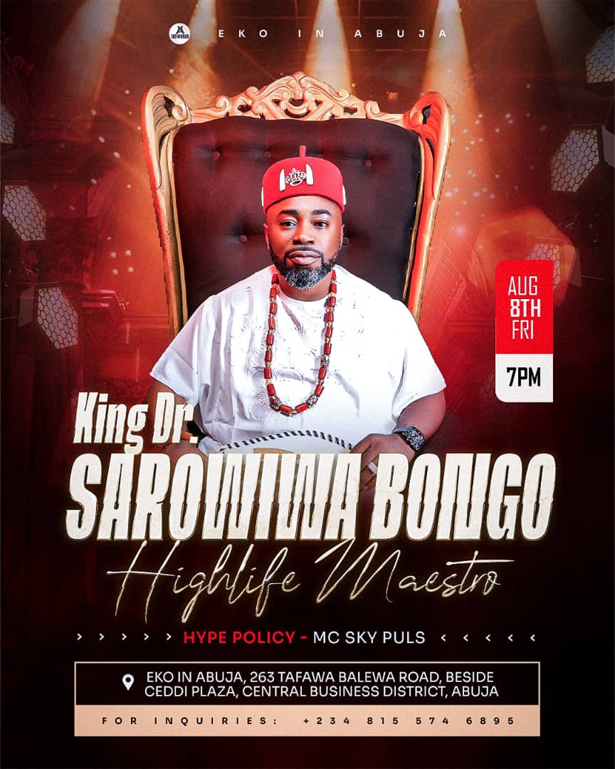 Popular highlife music star, King Dr. Sarowiwa Bongo is set storm the city of Abuja tonight, to give residents of the nation’s capital a memorable weekend.