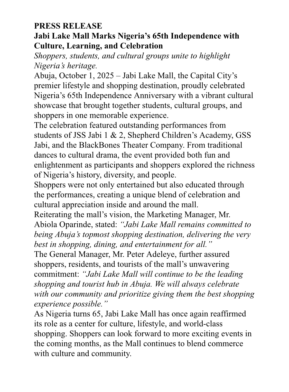 As Nigeria turns 65, Jabi Lake Mall has once again reaffirmed its role as a center for culture, lifestyle, and world-class shopping. Shoppers can look forward to more exciting events in the coming months, as the Mall continues to blend commerce with culture and community.