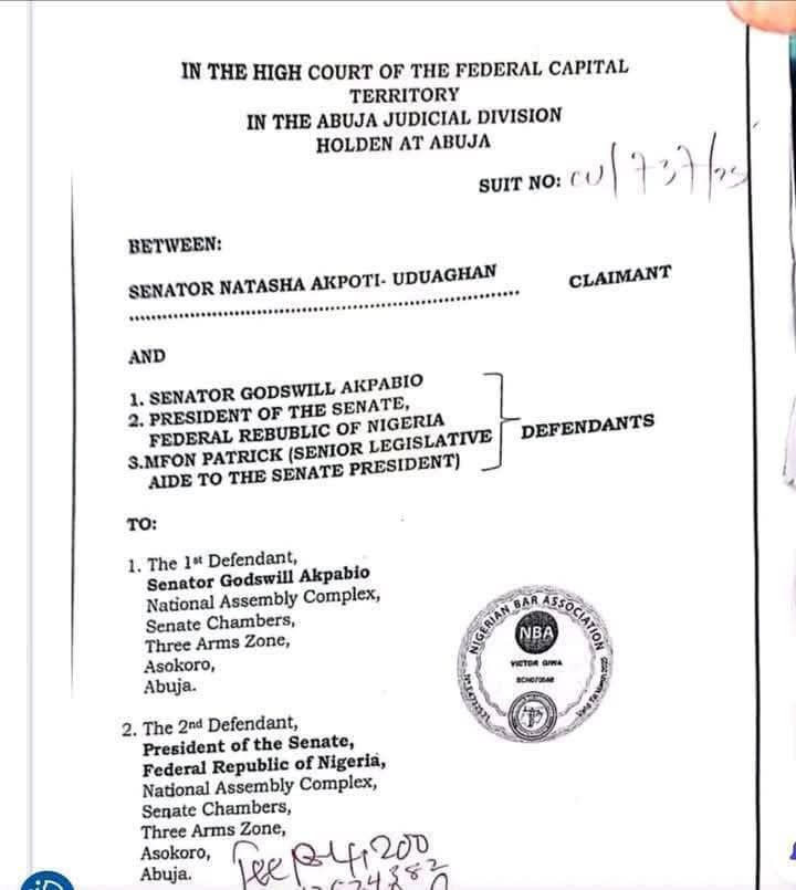 Senator Natasha Akpoti-Uduaghan has filed a lawsuit against the President of the Senate, Senator Godswill Akpabio, for alleged defamation.
