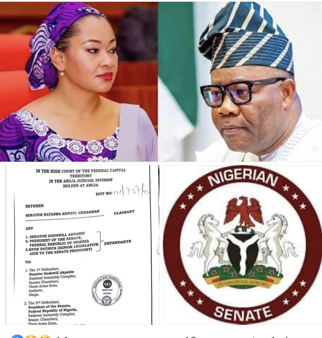 Just in.: Senator Natasha sues Senate president for 100Billion naira damages.