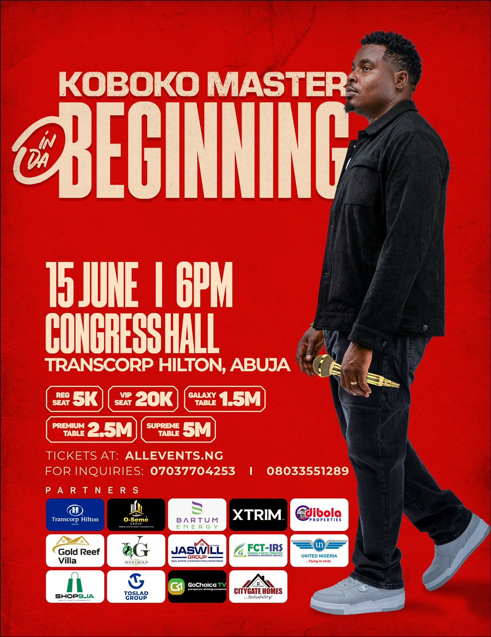 One of Abuja finest comedians, Mr. Gbadamosi ThankGod Benard, known by the stage name, Koboko Master is on the verge of making history as he will be the first comedian in the country to make use of the newly completed 3000-capacity event centre at the prestigious Transcorp Hilton Hotel Abuja for his comedy show, tagged “In Da Beginning”.