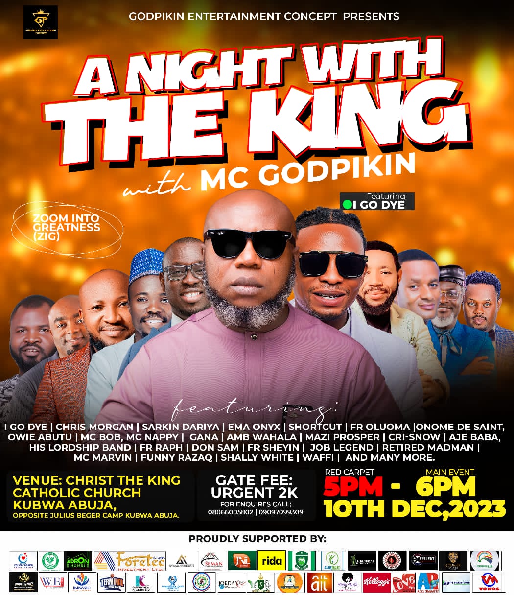 Prominent entertainers and anointed ministers of God are set to gracs the upcoming A Night With The King, being hosted by Godpikin Entertainment Concept, owned by MC Godpikin.