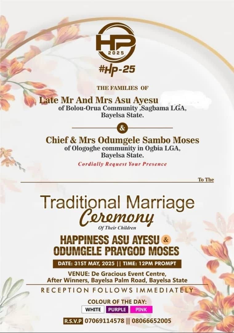 The Families of Late Mr and Mrs ASU AYESU Of Bolou-Orua community ,Sagbama LGA, Bayelsa State and Chief and Mrs Odumgele Sambo Moses of Ologoghe community in Ogbia LGA, Bayelsa State cordially invites the general public to the traditional Marriage Ceremony Of their children Happiness Asu Ayesu and Odumgele PrayGod Moses.