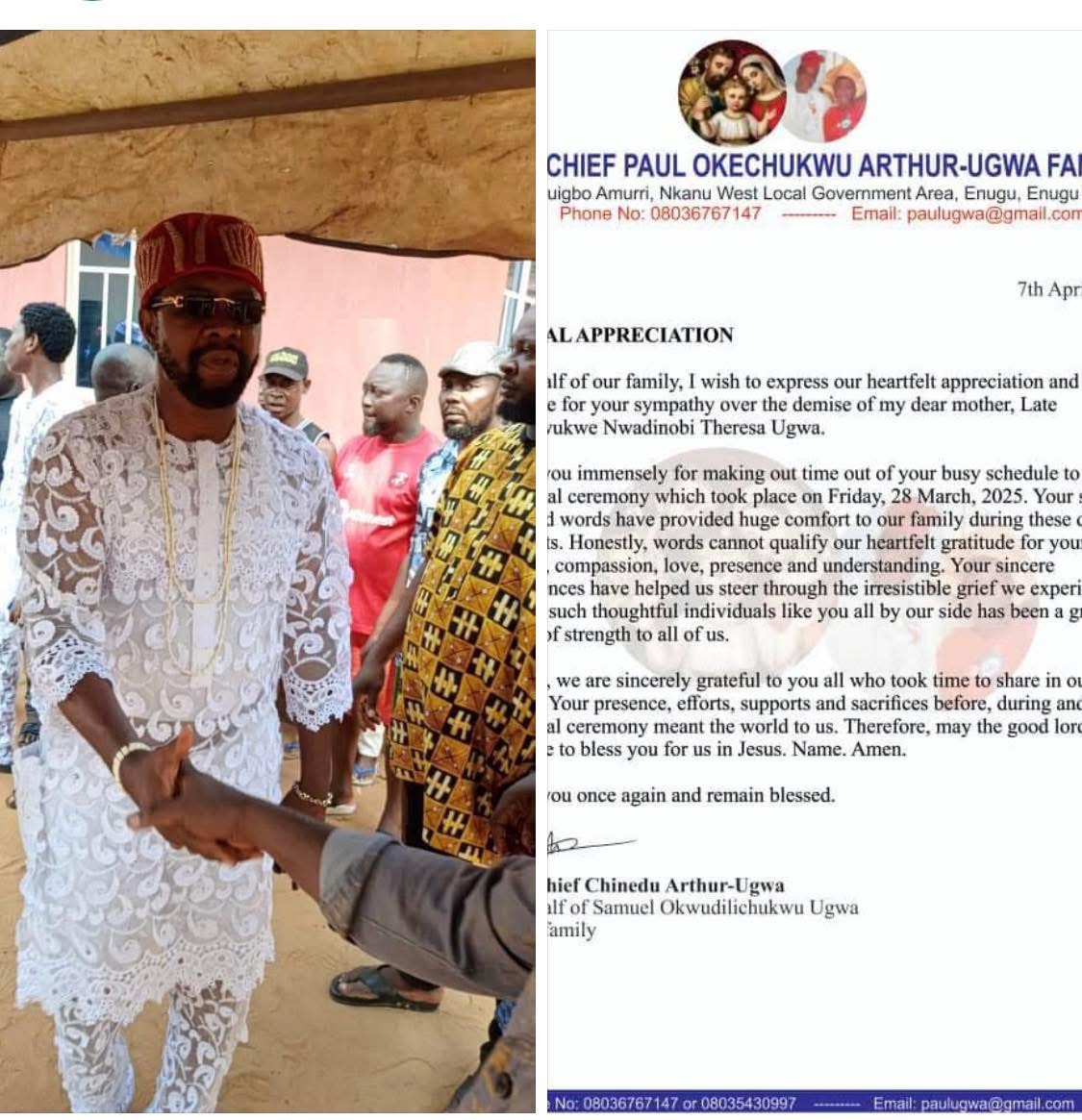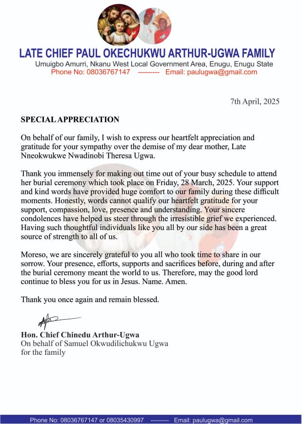Late Chief Paul Okechukwu Athur-Ugwa Family Appreciates the General Public for the support towards the successful Burial Ceremony of there beloved Mother.