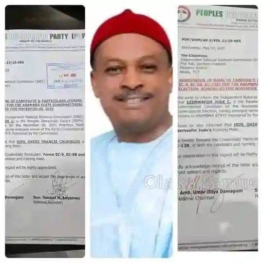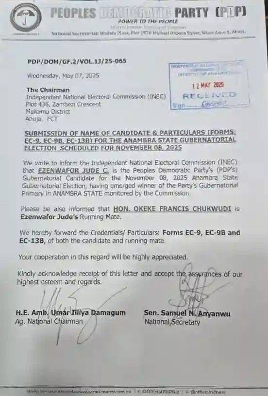 Letter sending Anambra PDP governorship candidate to INEC was signed by Damagum as Chairman and Samuel Anyanwu as National Secretary.