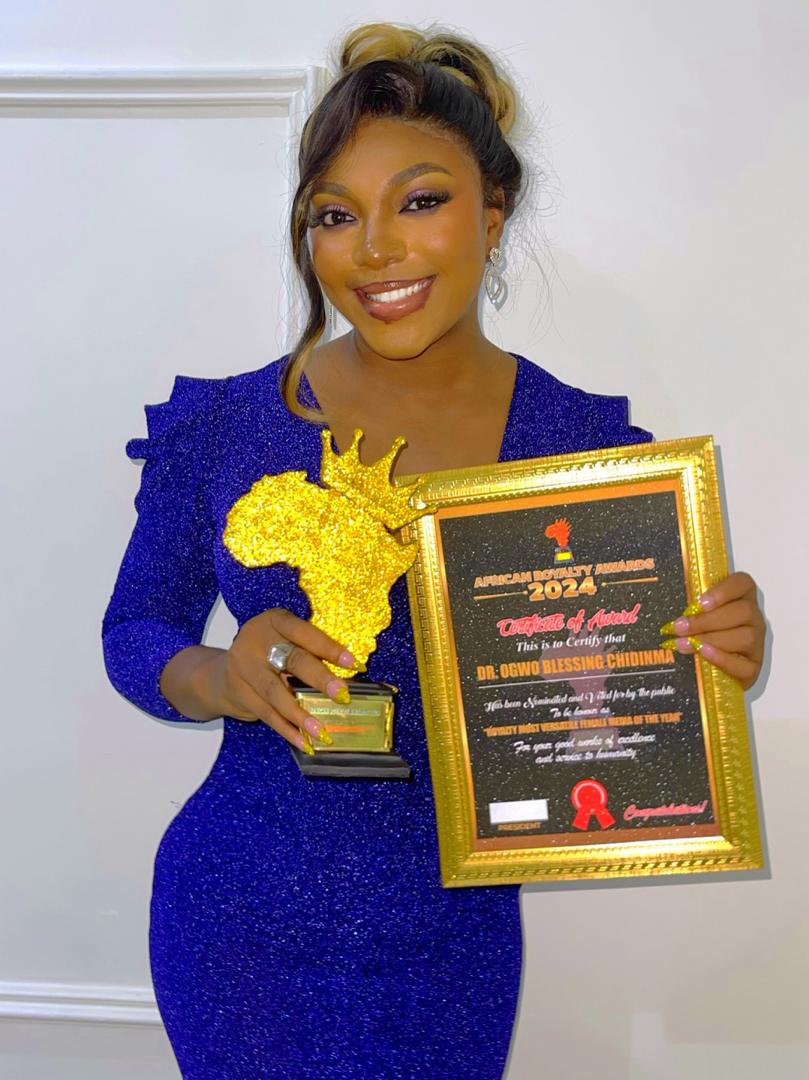 It is on this premise that she has bagged several recognitions on the account of her hard work and knack for excellence. She is Award winning most versatile female media personality of the year award 2024.